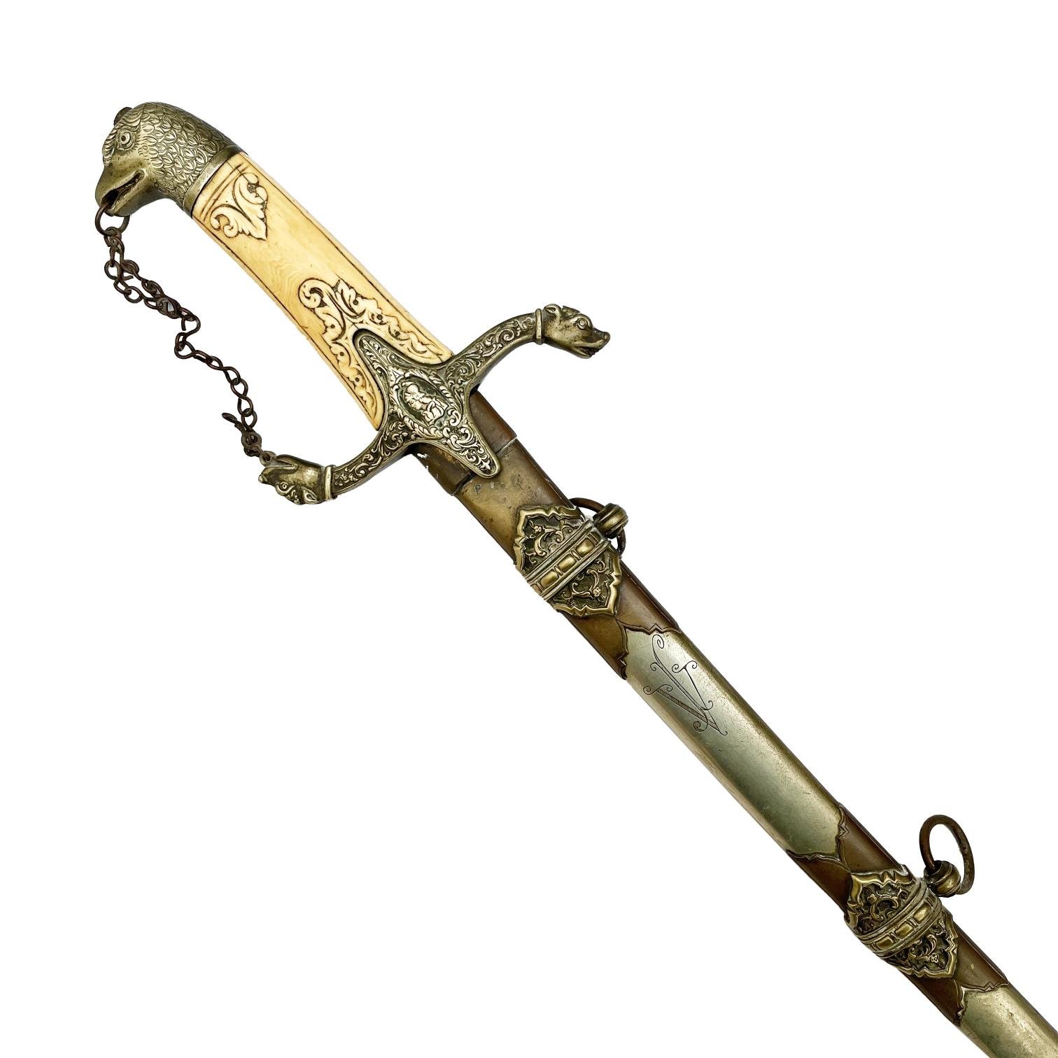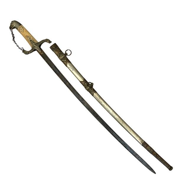 Sable uruguayo. Hoja grabada al ácido «escudo de armas uruguayo» y «alegoría de la libertad», con realces en oro. Lomo marcado por la casa importadora «Clerc y Dijon, Montevideo». Empuñadura en marfil tallado, con pomo en metal esculturado «cabeza de águila» y gavilán en metal decorado «guerreros» y «cabezas de perro». Vaina en metal niquelado, grabada con iniciales «J.V.».