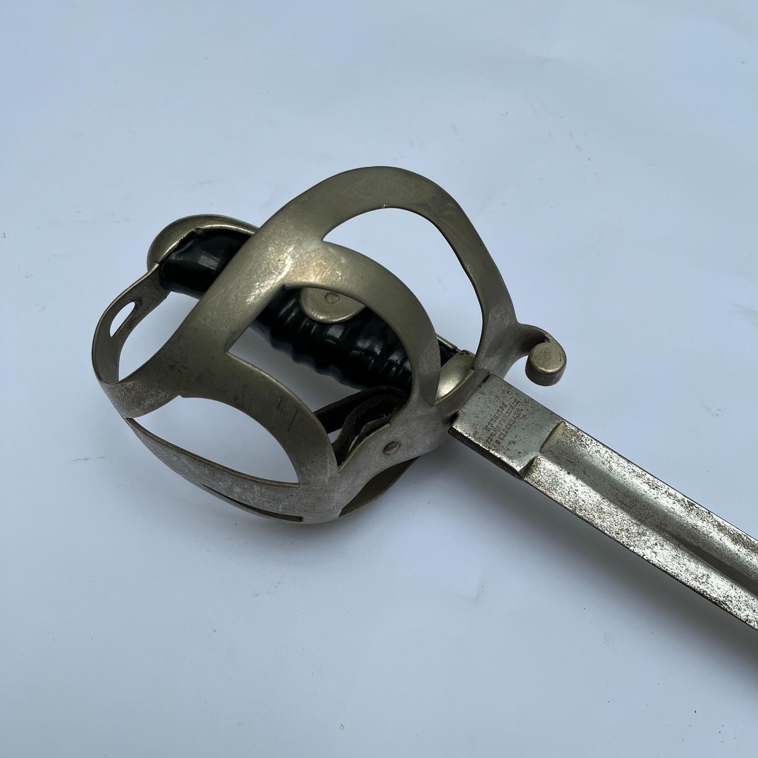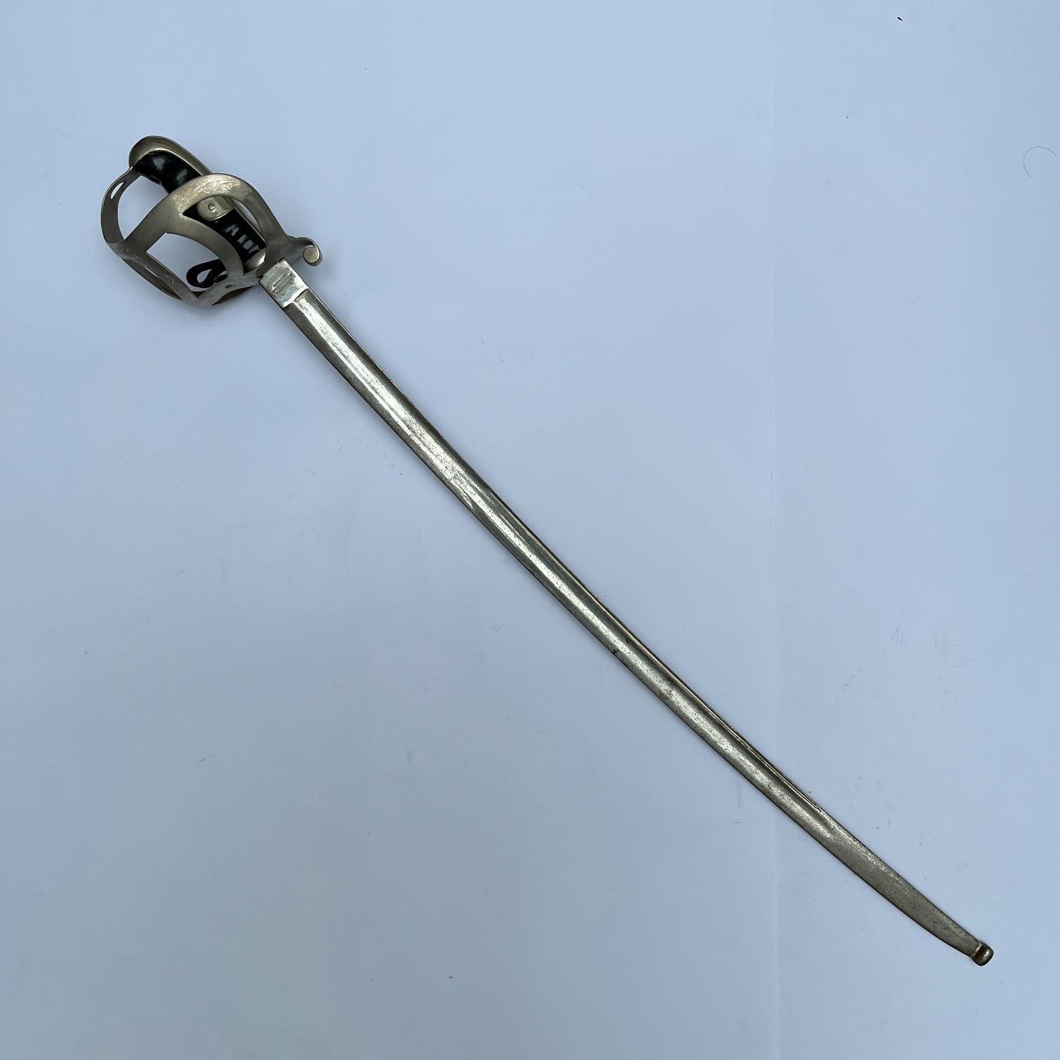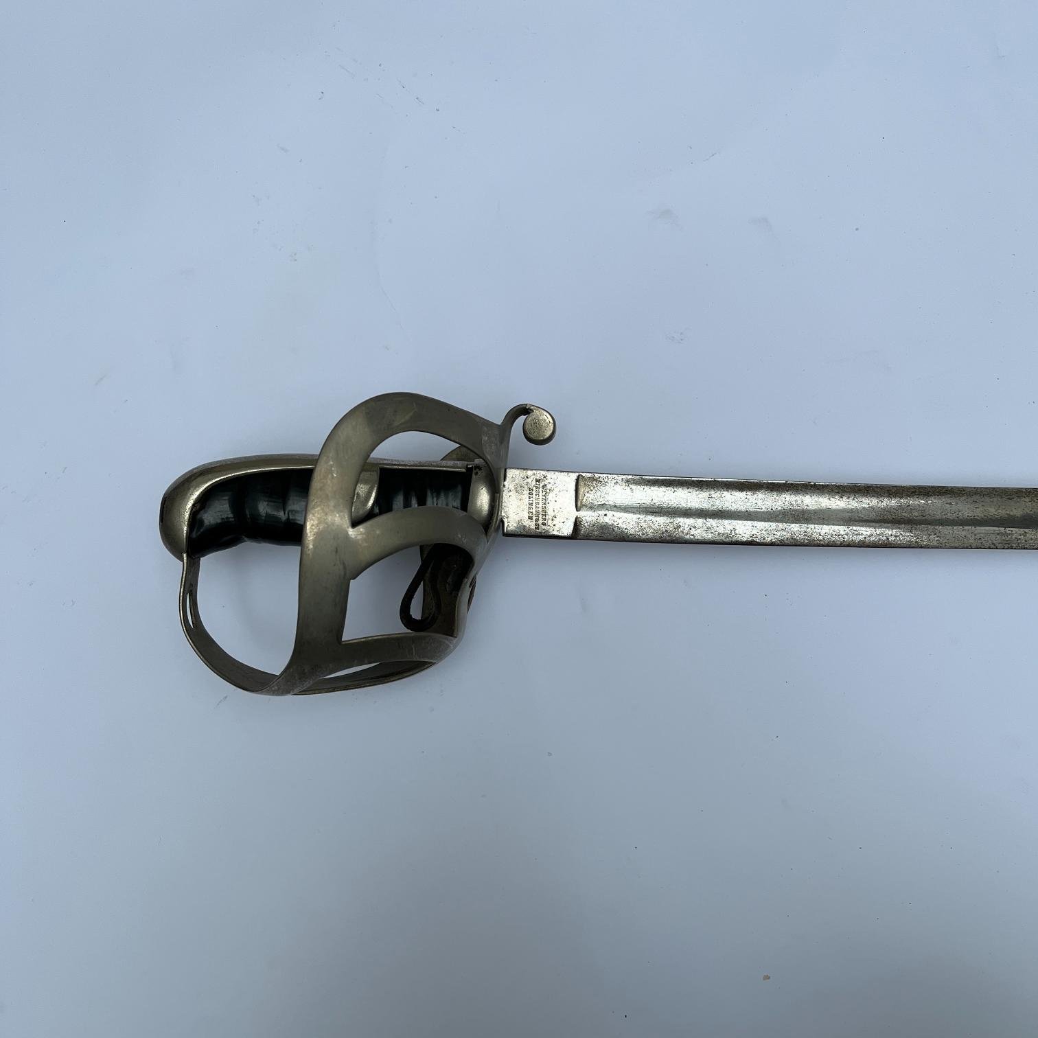Sable de caballería y artillería a caballo, de entrenamiento, modelo prusiano 1852, utilizado por el ejército uruguayo entre 1905 y 1916. Guardamanos en acero marcado «Junta A. Militar» y «escudo de armas». Empuñadura gallonada con torzal de alambre. Punzón «Weyersberg, Kirchbaum & Co., Solingen».
