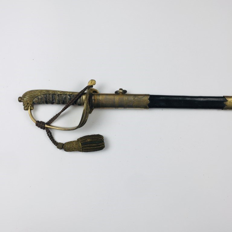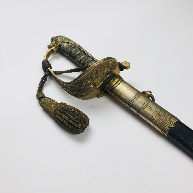 Sable uruguayo para oficial de la Armada. Empuñadura forrada en cuero de lagarto con filigrana en bronce. Pomo esculturado «cabeza de león». Guardamano en bronce cincelado «Sol de Mayo». Vaina picasa en cuero negro con bocavaina, pasador y puntera en bronce cincelado.