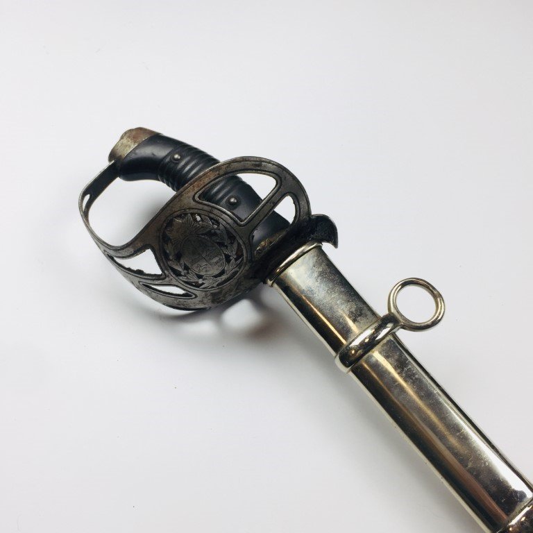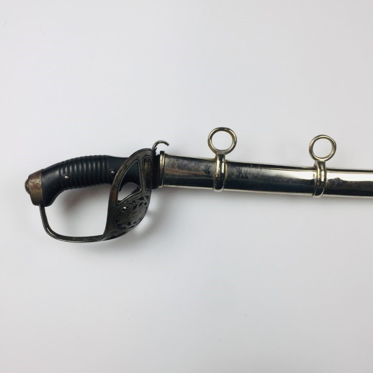 Sable uruguayo curvo de caballería, modelo 1898. Hoja marcada «República del Uruguay». Empuñadura en baquelita negra. Guardamano calado «escudo de armas uruguayo». Vaina en metal niquelado, con dos anillas. Fabricado por WKC, Solingen.