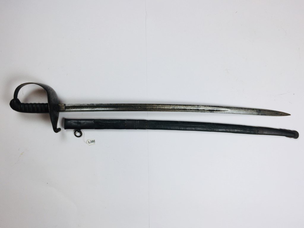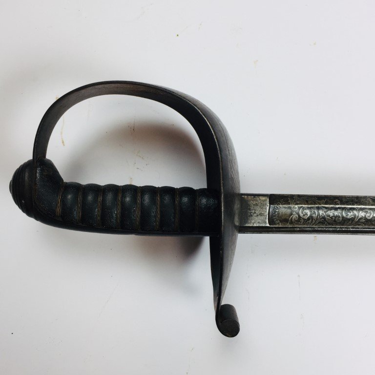 Sable uruguayo, siglo XIX. Cazoleta y hoja totalmente talladas al ácido «hojas» y «escudos nacional uruguayos», empuñadura en madera forrada en piel de raya con filigrana en bronce, vaina picasa en cuero negro con bocavaina, pasador y puntera en hierro cincelado «hojas». Fabricado por Gustav Grah, Solingen. Largo total 90 cm.