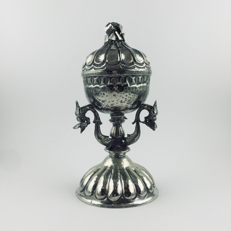 Sahumador boliviano en metal martelé. Tapa con pomo esculturado «flor», pie de tres ramales esculturado «animales mitológicos» y base lobulada. 29 x 14 cm.