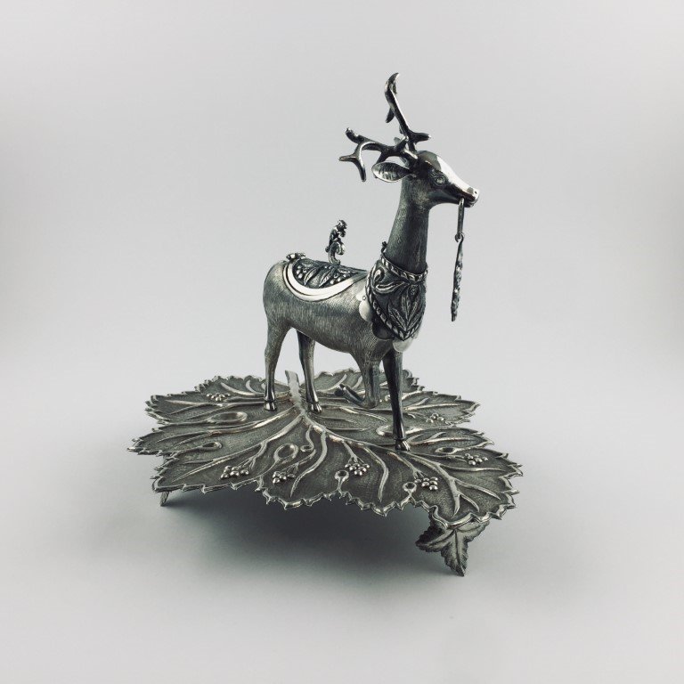 Sahumador en plata esculturada «ciervo del altiplano sobre hoja de vid». 23 x 24 x 21 cm.