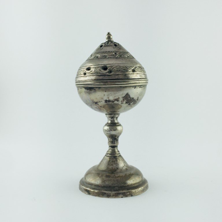 Sahumador hispanoamericano s. XVIII en plata calada y cincelada «hojas y flores». Base redonda. Alto 17 cm.