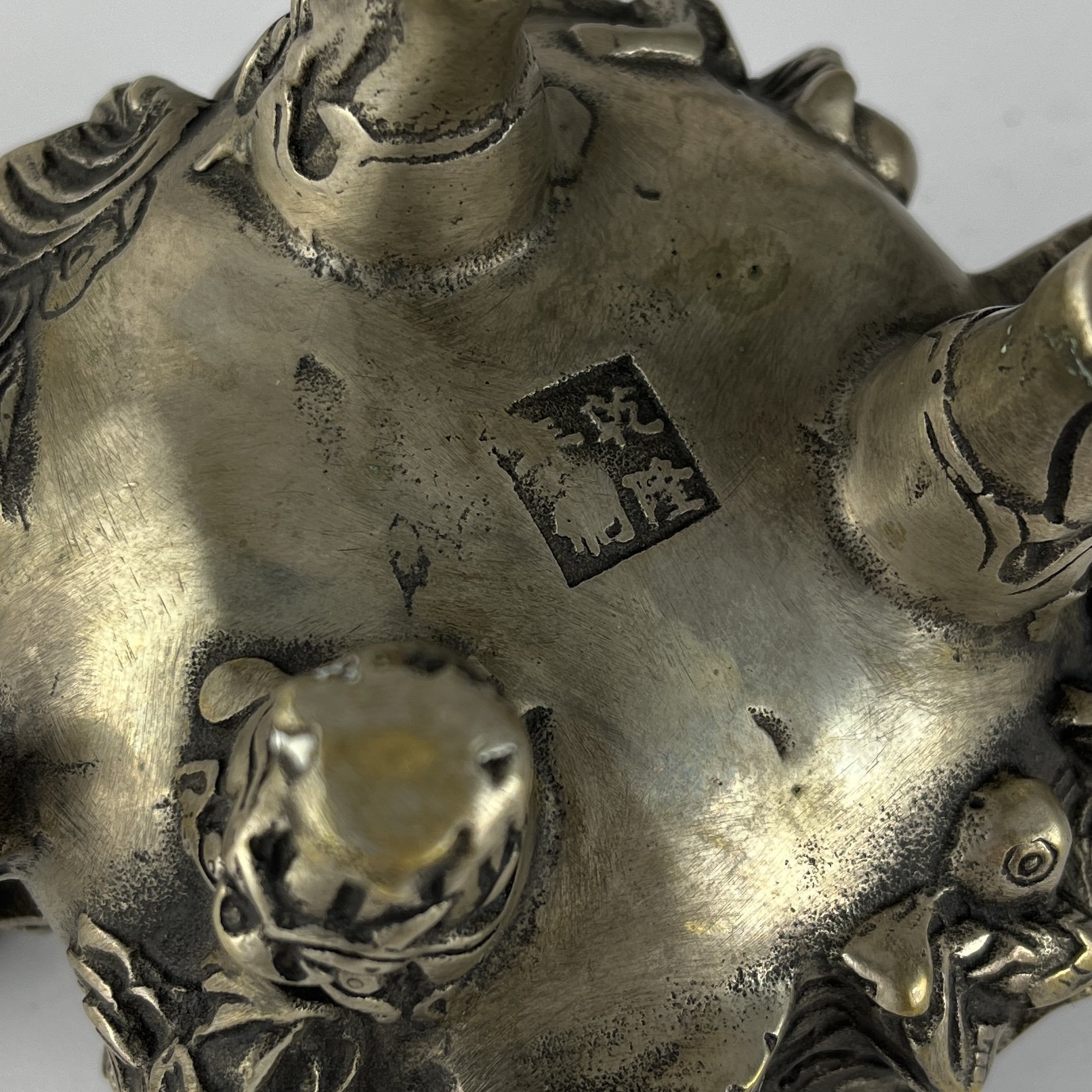 Sahumador oriental en metal esculturado «personajes y animales mitológicos». 14 x 10 cm.