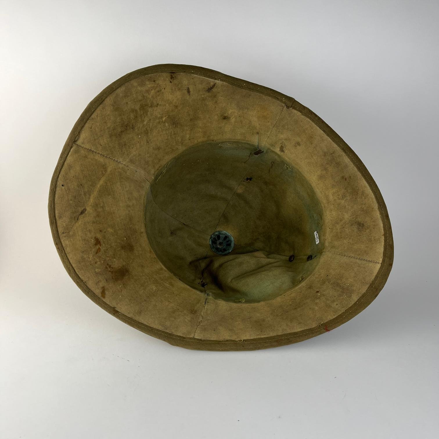 Casco salacot italiano, WWII, forrado en paño, con insignia frontal en tela y latón. Copa con avería.