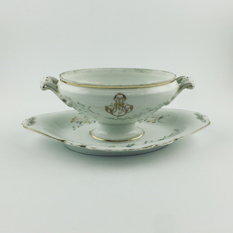 Salsera en porcelana color blanco decorada «flores» con detalles en oro e iniciales «M.S.», pertenecientes a Máximo Santos. 10 x 27 x 17 cm. Falta tapa.