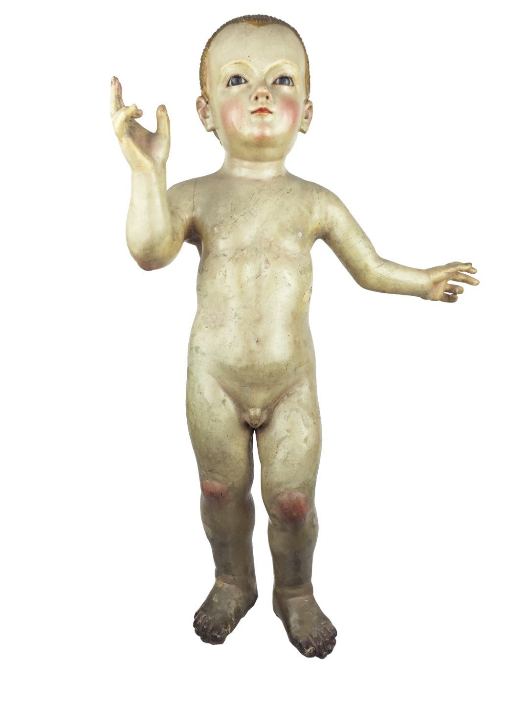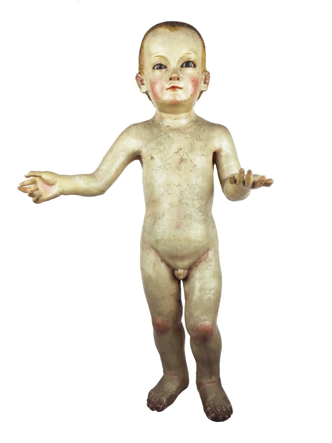 Par de santos de vestir tallados en madera policromada, con ojos en vidrio. «Niño Jesús.» Alto 56 cm.