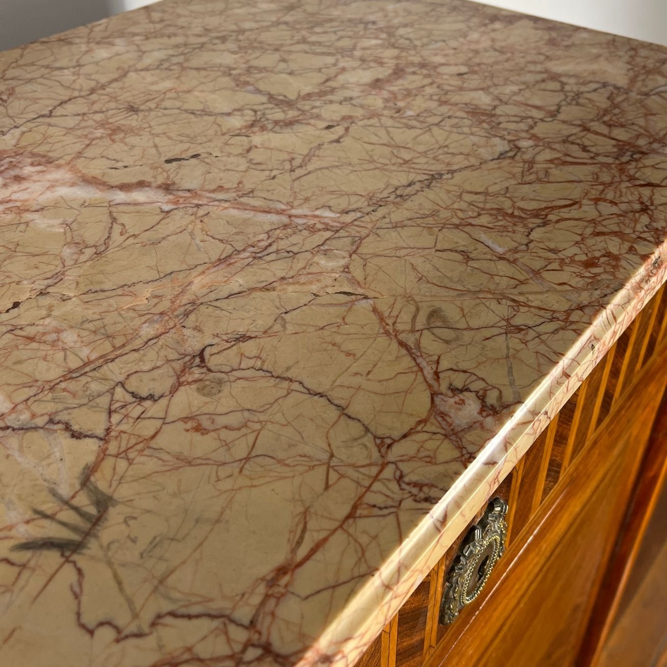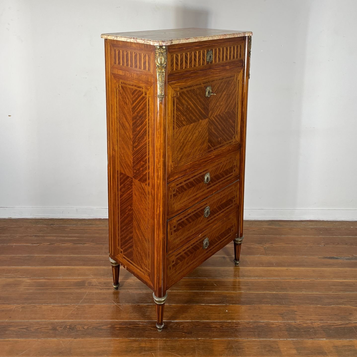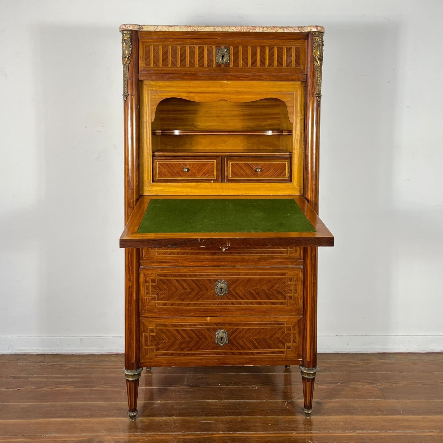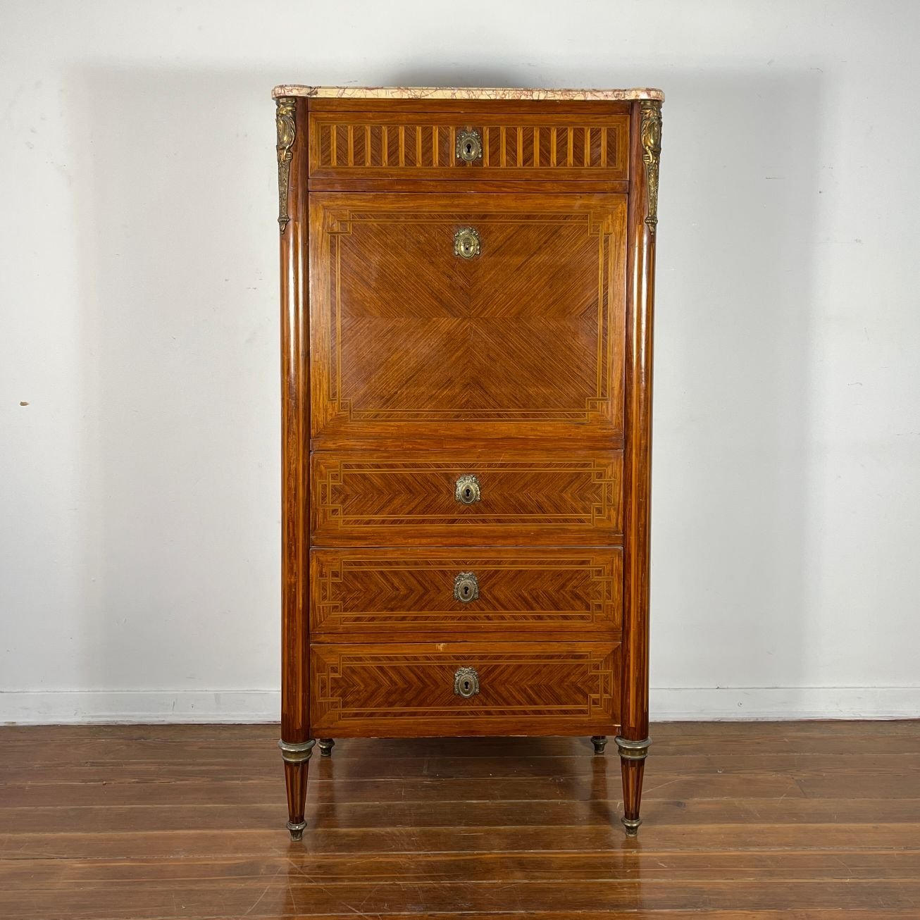 Secrétaire francés estilo Luis XVI enchapado en palo de rosa con marqueterie lineal. Tapa de volcar y cuatro cajones con bocallaves y aplicaciones en bronce. Tapa en mármol veteado. 139 x 71 x 44 cm.