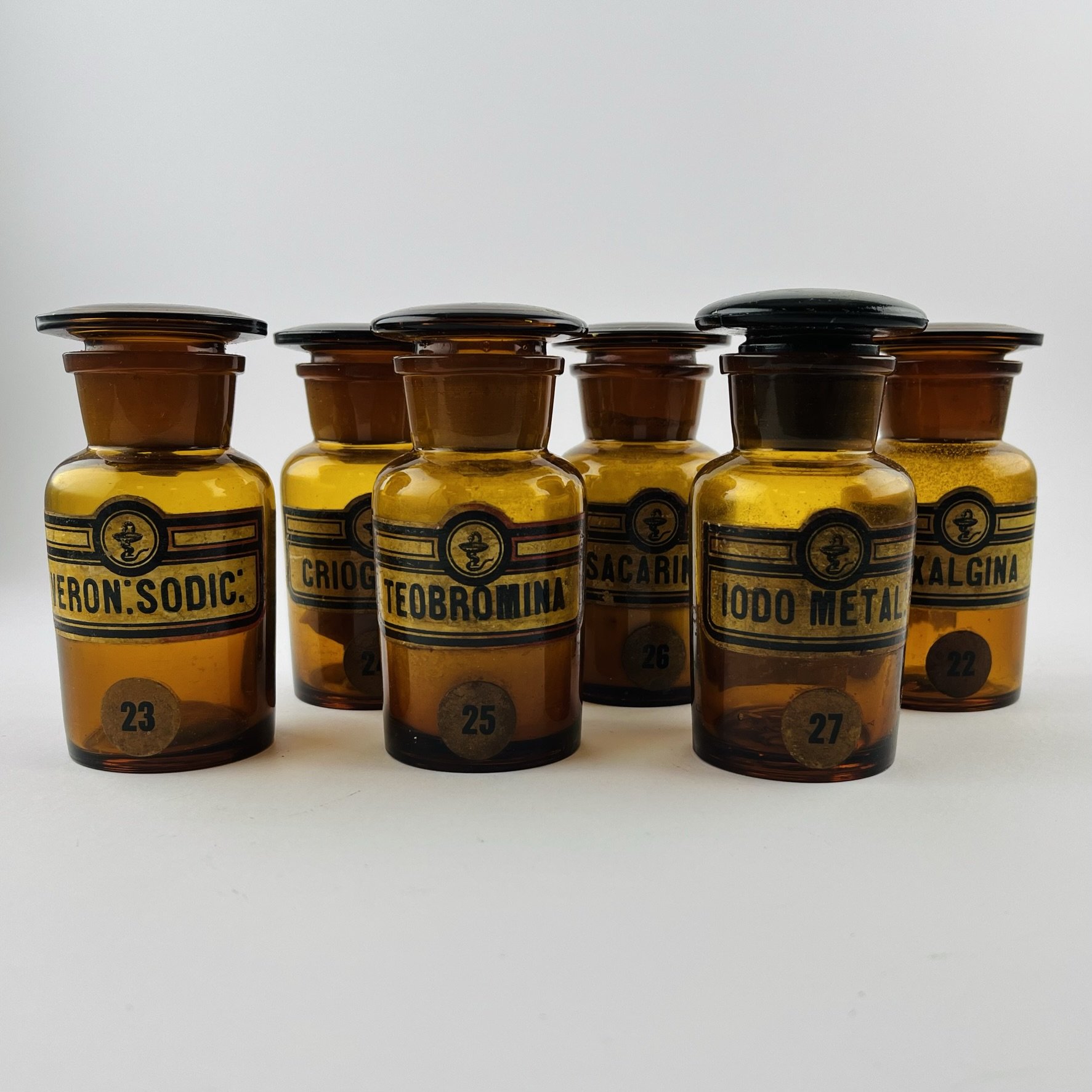 Seis frascos de farmacia en vidrio soplado color marrón con etiquetas en papel impreso decoradas «copas de Higía», con inscripciones «Exalgina», «Veron: Sodic:», «Criog: Lum:», «Teobromina», «Sacarina» y «Iodo Metal», numerados «22», «23», «24», «25», «26», «27». Altos 11 cm.