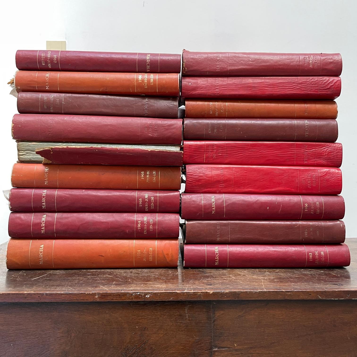Colección de 399 ejemplares del semanario Marcha publicados entre 1963 y 1973, nos. 1163 a 1649, no correlativos. Encuadernados en dieciocho tomos.