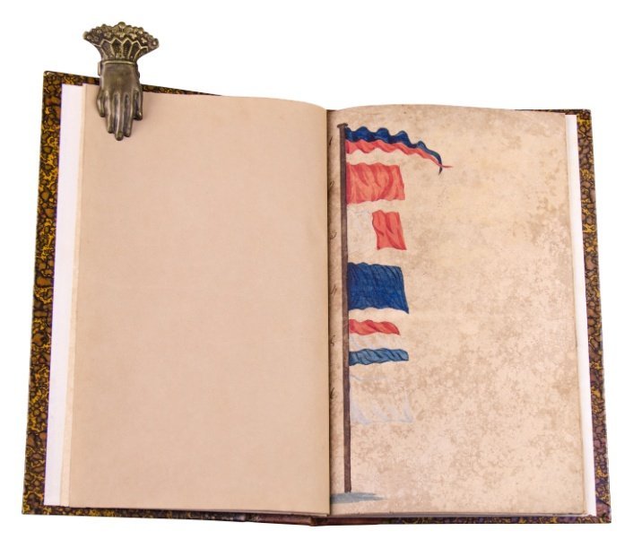 La obra contiene las señales emitidas por los buques para informar a la capitanía del puerto a través de una y dos banderas. En la primera hoja vemos un mástil con las seis banderas, pintadas y numeradas. El sistema buscaba despertar un llamado de atención temprano frente a cualquier riesgo o novedad advertido.