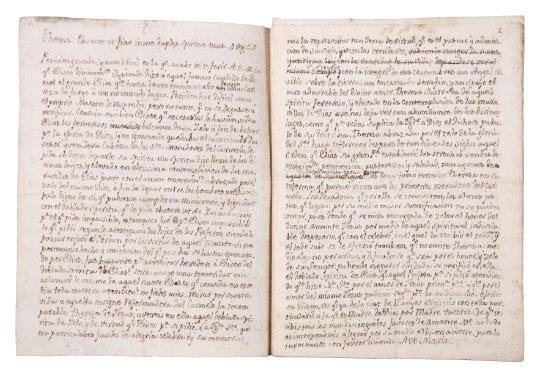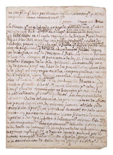 Santa Teresa de Jesús (1515 – 1582) fue canonizada en 1622, y su Santidad Pablo VI le reconoció el título de Doctora de la Iglesia el 27 de septiembre de 1970, junto a Santa Catalina de Sena, las primeras mujeres que recibieron este título. Fundadora de los monasterios de monjas y frailes Carmelitas descalzos de la primera regla, sus textos recorrieron España en copias manuscritas, pues la Inquisición y otros avatares demoraron su publicación al punto que su autora no llegó a verlos impresos en vida. Entre los mayores obstáculos, la palabra de Teresa de Jesús fue censurada por la Inquisición de Sevilla, en cuyo Tribunal afirmaron: “doctrina nueva, supersticiosa y de embustes…”. Al fin en 1588 y en las prensas de Guillermo Foquel de Salamanca fue publicada la versión revisada por Fray Luis de León. Desde aquella primera edición, su obra recorrió el mundo a través de la mística carmelitana, y como es de imaginarse, lo hizo por medio de la letra impresa y de los textos manuscritos que, en el deseo de transmitir su voz, eran copiados para el uso cotidiano. Junto a San Juan de la Cruz, fue la más destacada autora de España en la denominada Escuela ecléctica.