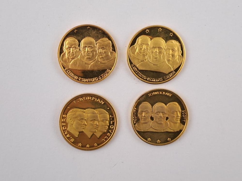 Set de cuatro medallas “Apollo” en oro 900, Nos. 8, 9, 10 y 11. Peso total 19,99 gr. Acuñadas por Euronummus, en estuche original.