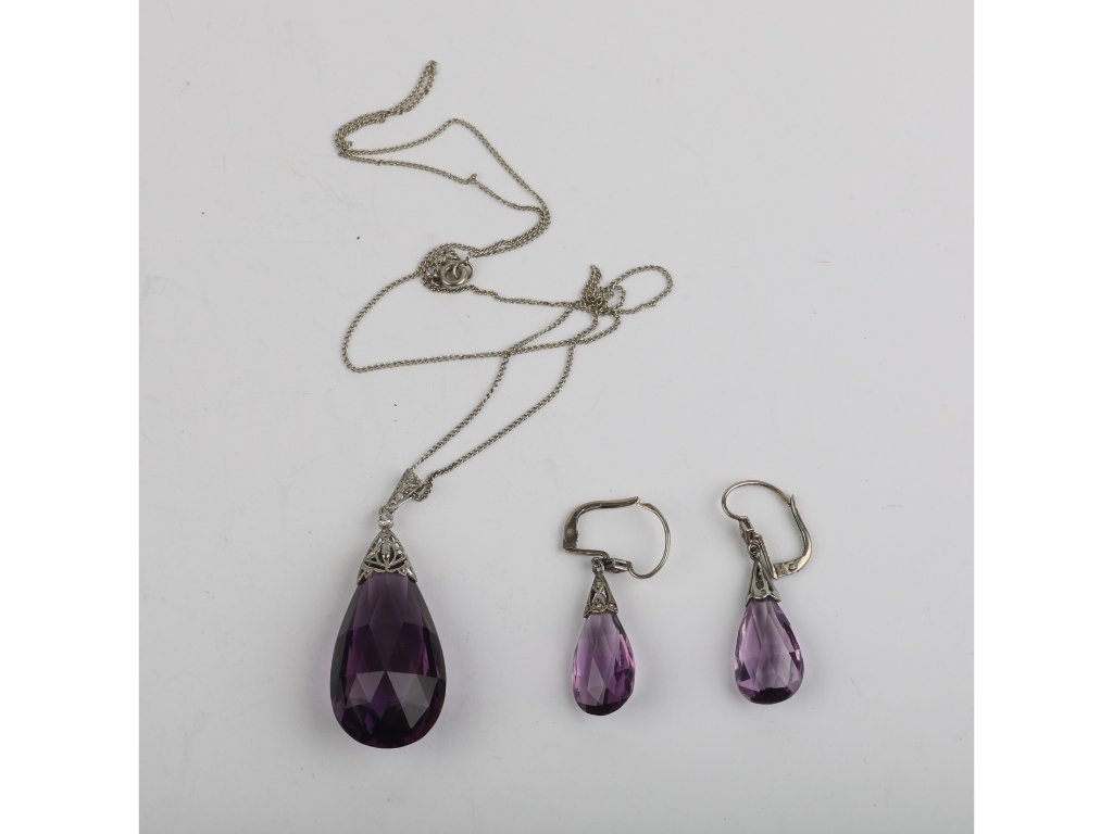 Set art decó compuesto por colgante con cadena y par de caravanas en oro 18 K blanco. Colgante con pequeño brillante y amatista talla lágrima de 32 x 18 x 12 mm. Par de caravanas con un pequeño diamante y una amatista talla lágrima de 18 x 10.5 x 6 mm, cada una. Peso total bruto 13.5 gr.