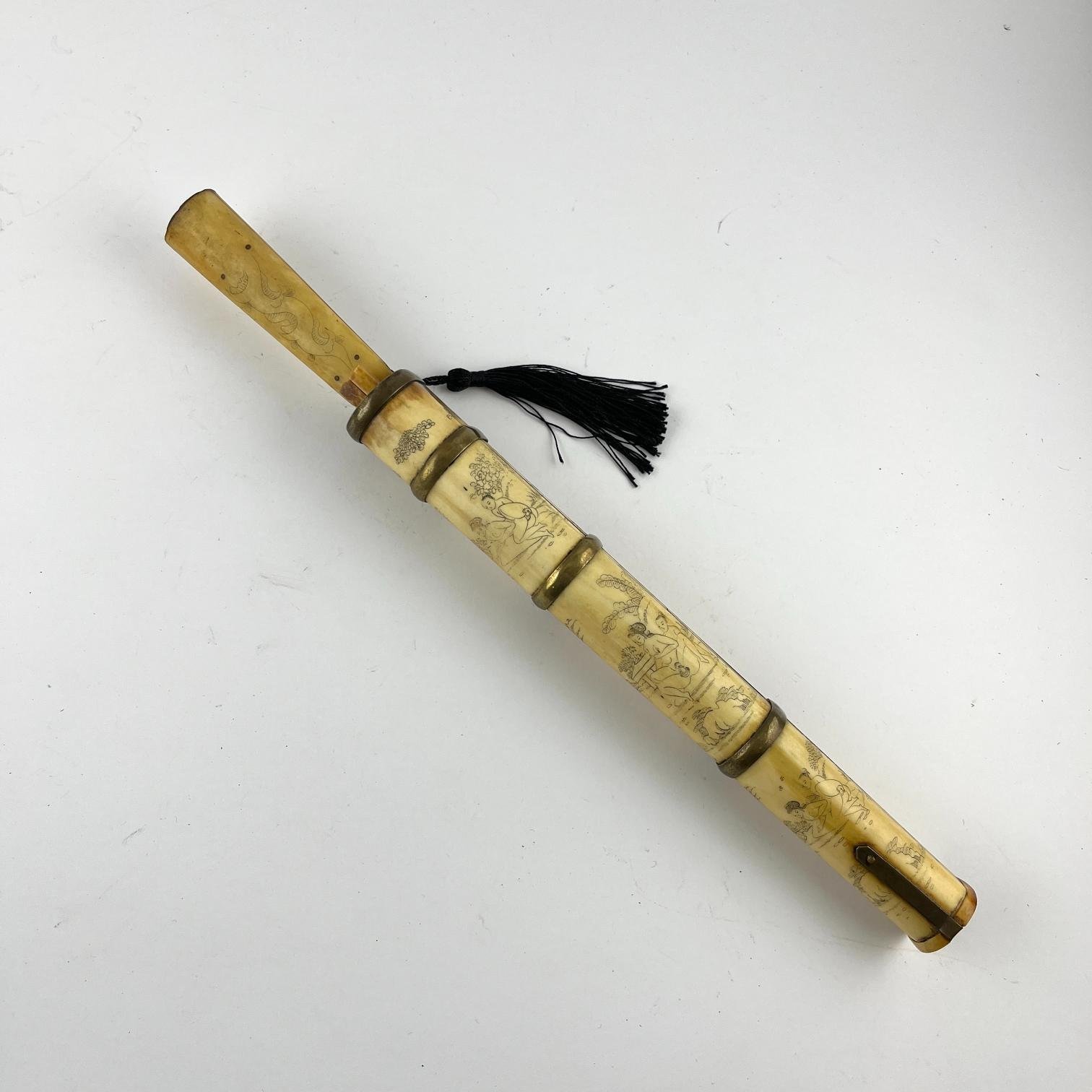 Juego chino de cuchillo y par de palillos de viaje. Cabo y palillos en hueso grabado “escenas eróticas”, con monturas en bronce. Largo total 35 cm.