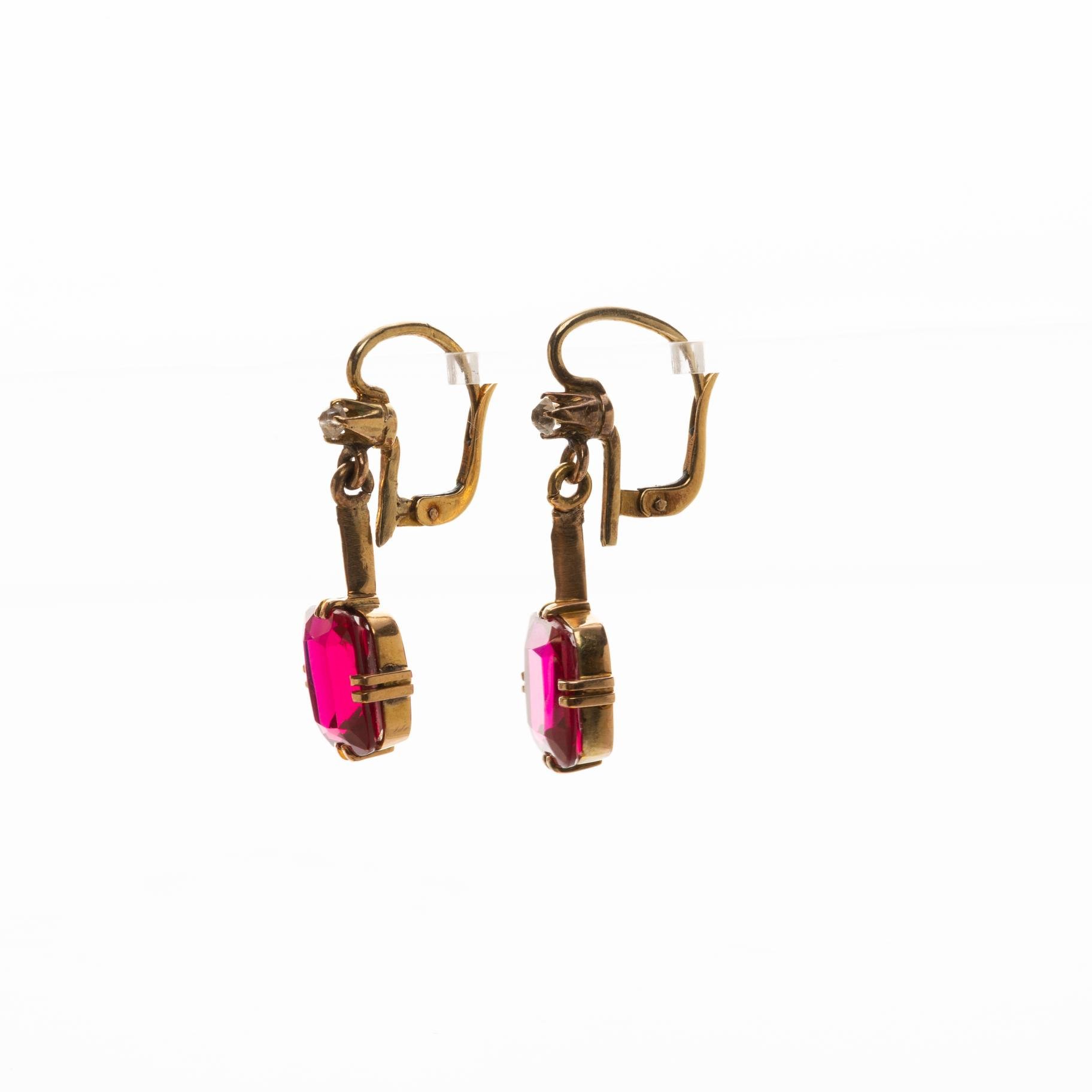 Set de anillo y par de caravanas en oro amarillo con piedra color rubí. Alto de caravanas 30 mm. Diámetro interno de anillo 16,5 mm. Peso total bruto 7,3 gr.