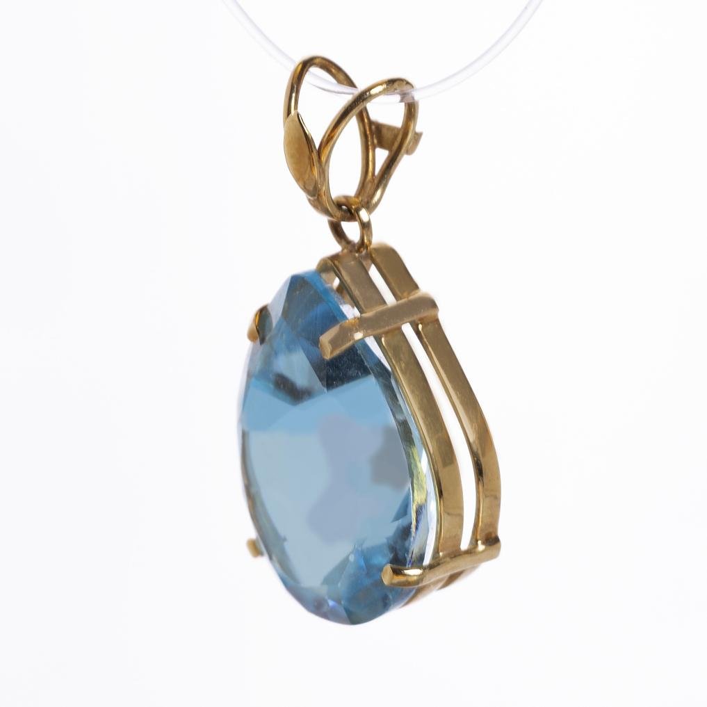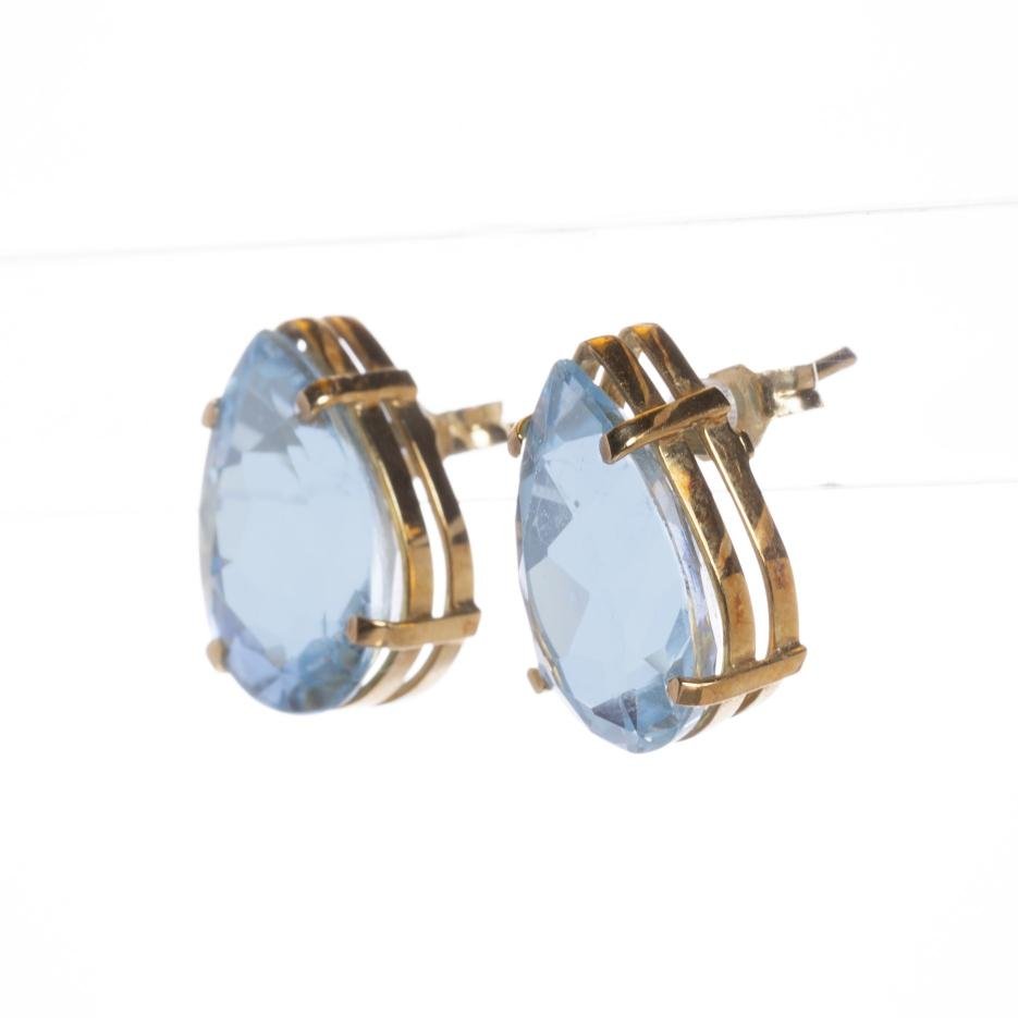 Set de colgante y par de caravanas tipo tornillo en oro 18 K amarillo con un topacio color celeste talla gota en cada pieza. Alto colgante 22 mm. Alto caravanas 14 mm.