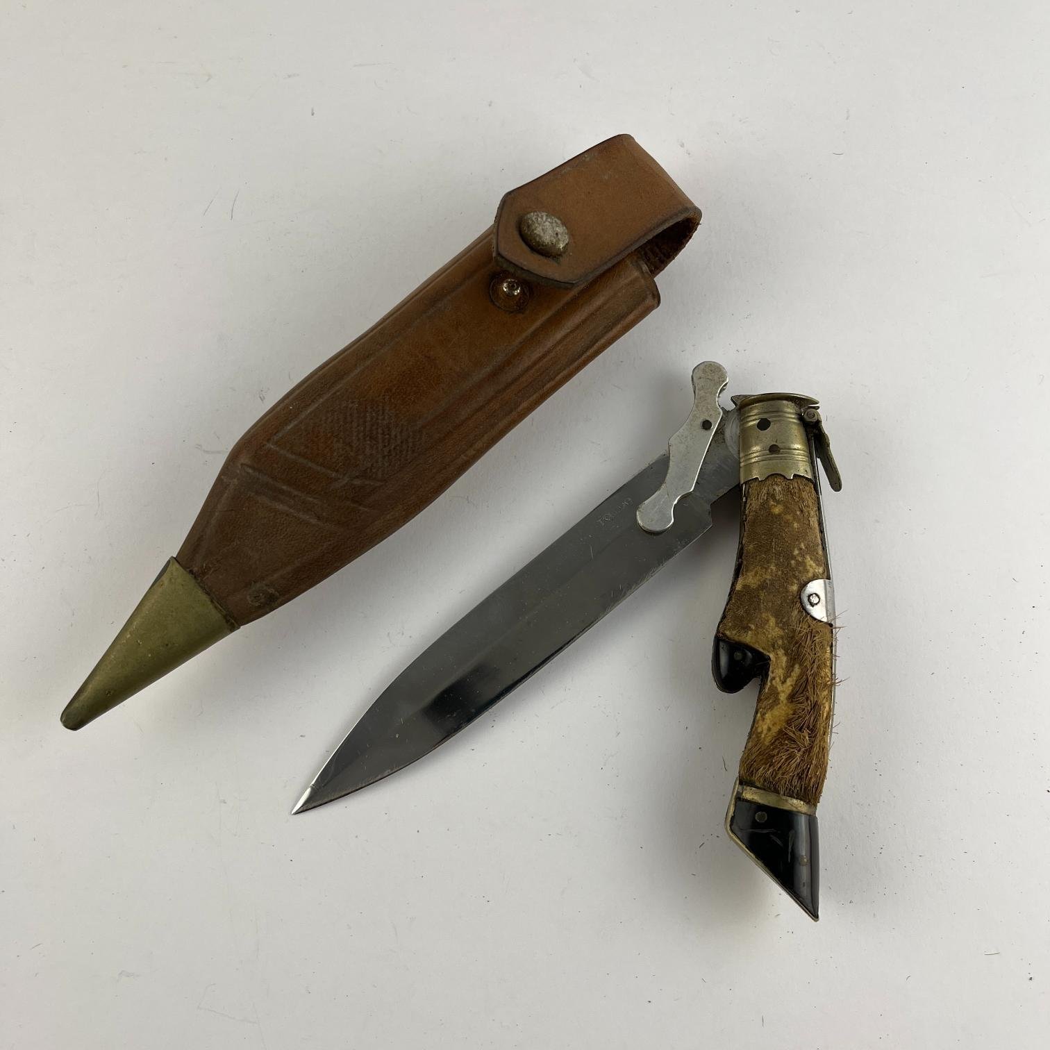 Sevillana con empuñadura de pata de cabra. Toledo. Vaina en cuero y latón. Largo 25 cm.