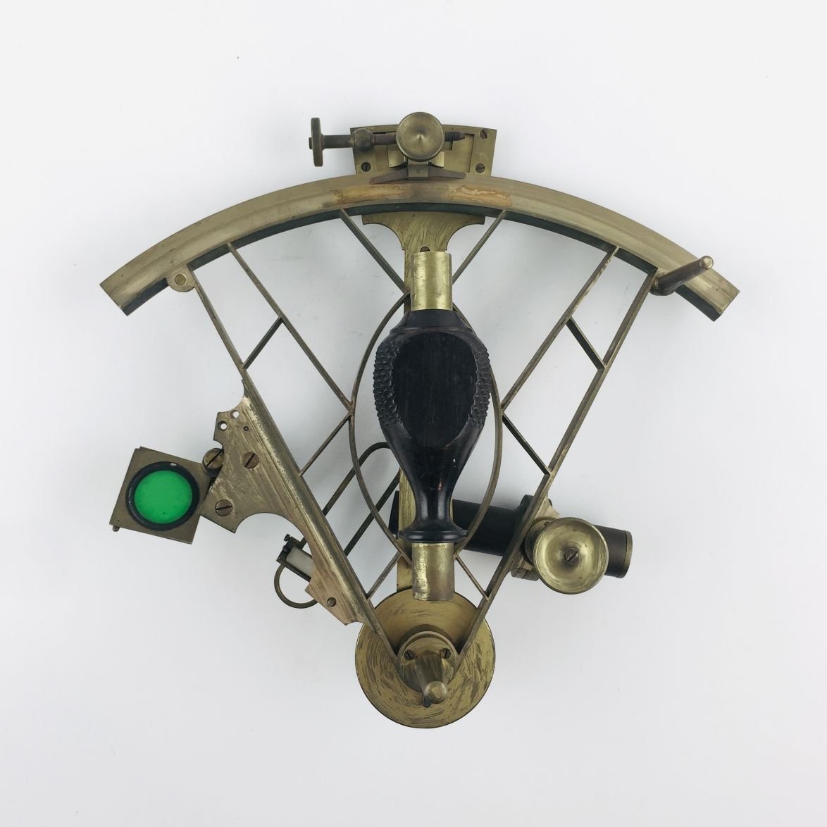 Sextante inglés en bronce con asa en madera segrinada. Marca del fabricante J. Hughes, Londres.