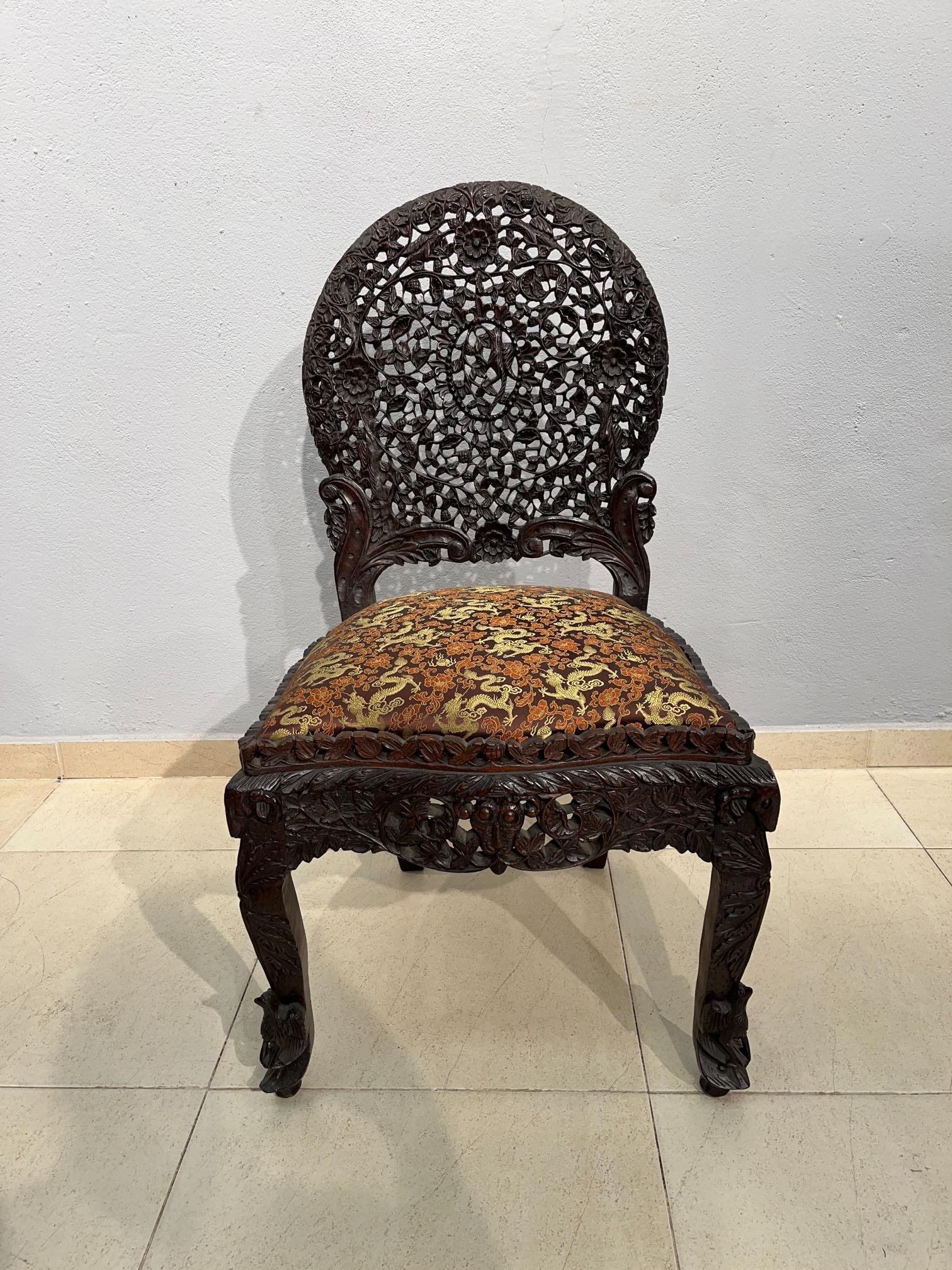 Silla indochina en madera tallada, con asiento tapizado «dragones» en seda.