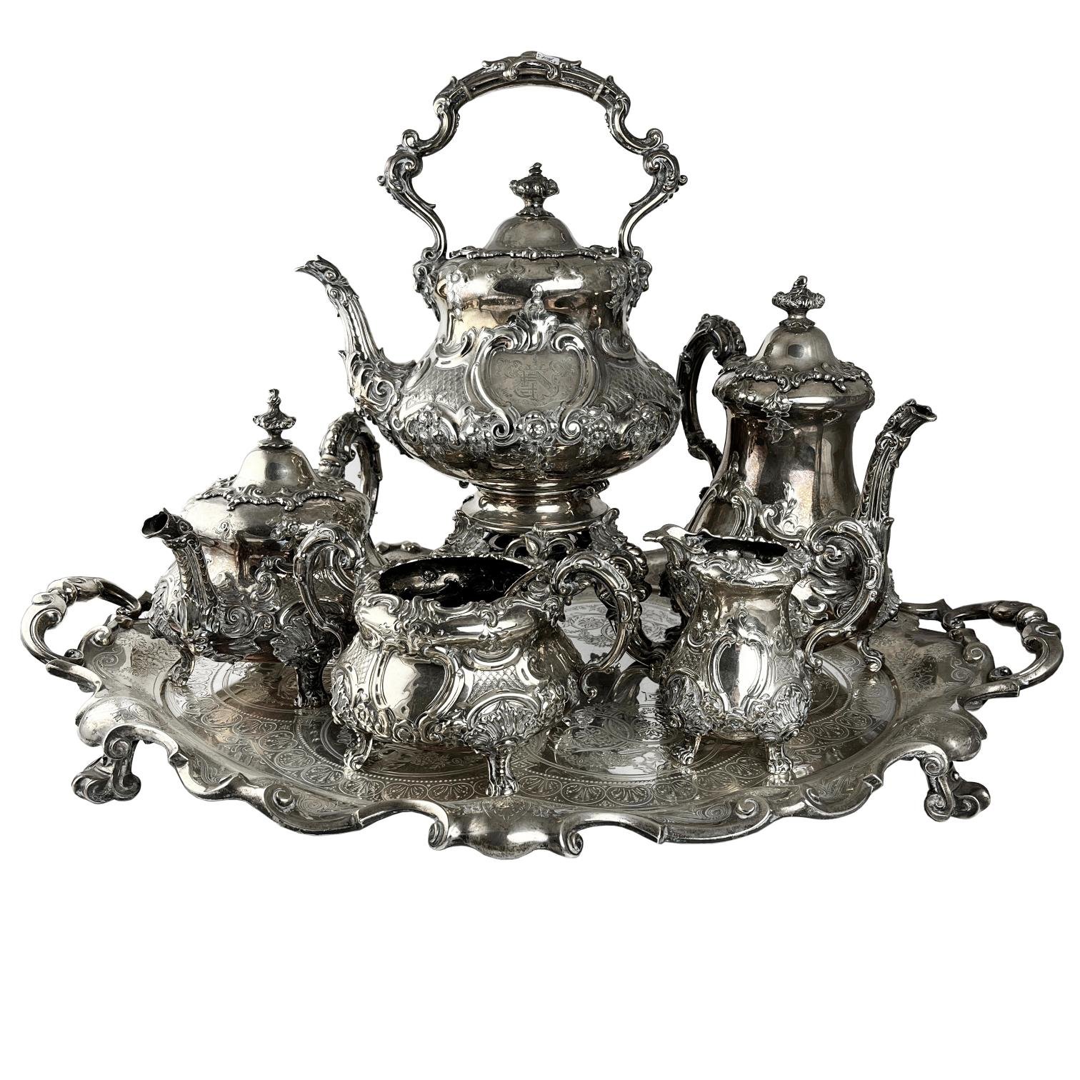 Juego inglés para servir té y café en plata de Londres año 1850 cincelada “hojas y flores”. Compuesto por samovar, tetera, cafetera, lechera y azucarero. Presentado en bandeja oval en plata de Londres año 1894, con asas, cuatro patas y borde en ondas. Peso total 8.900 gr. Ex colección Hilda Schlösser de Slowak.