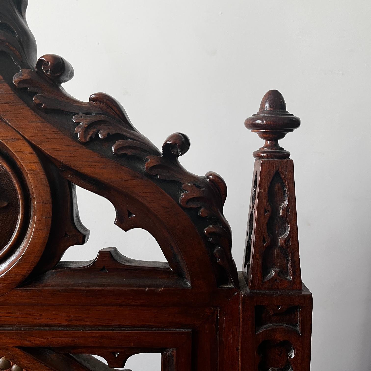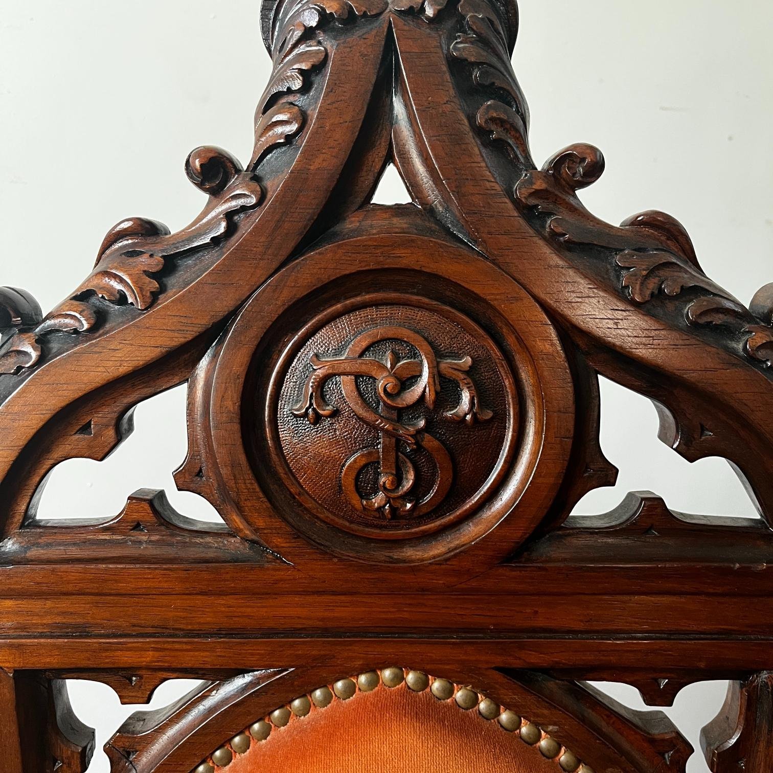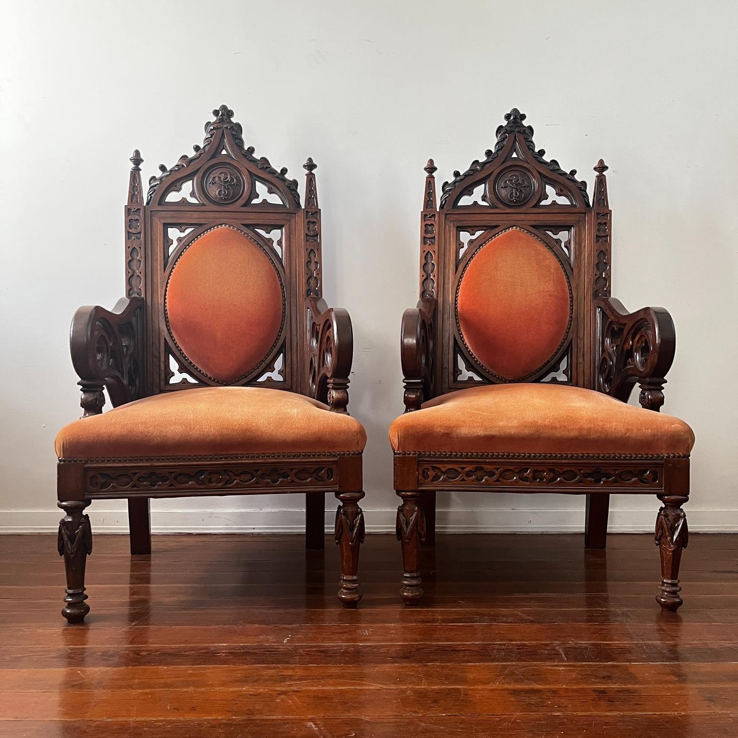 Par de sitiales s. XIX estilo neogótico en madera de cedro calada y tallada «hojas y frutos», con iniciales «S.T.» en respaldo, pertenecientes a Salvador Tajes (1852-1912). Asientos y respaldos tapizados en pana.