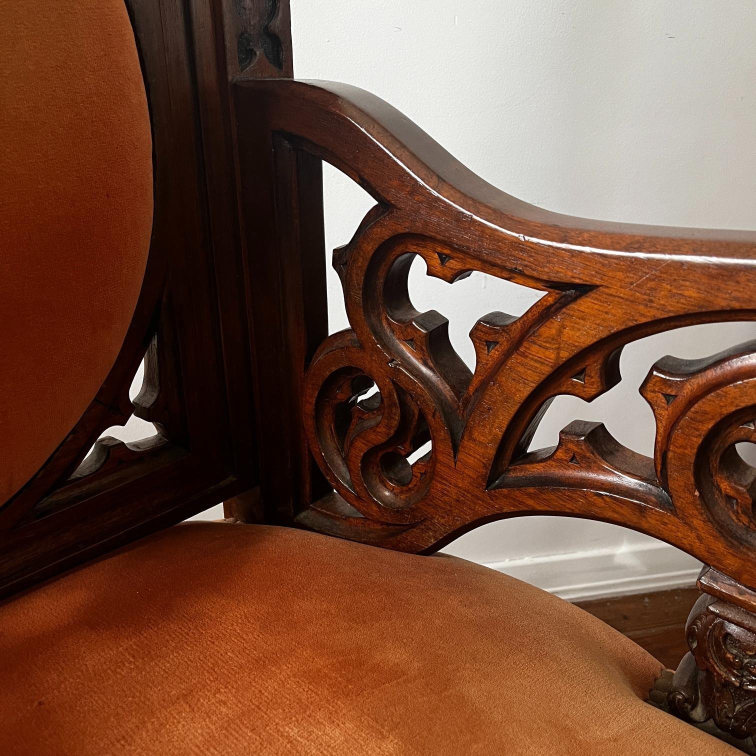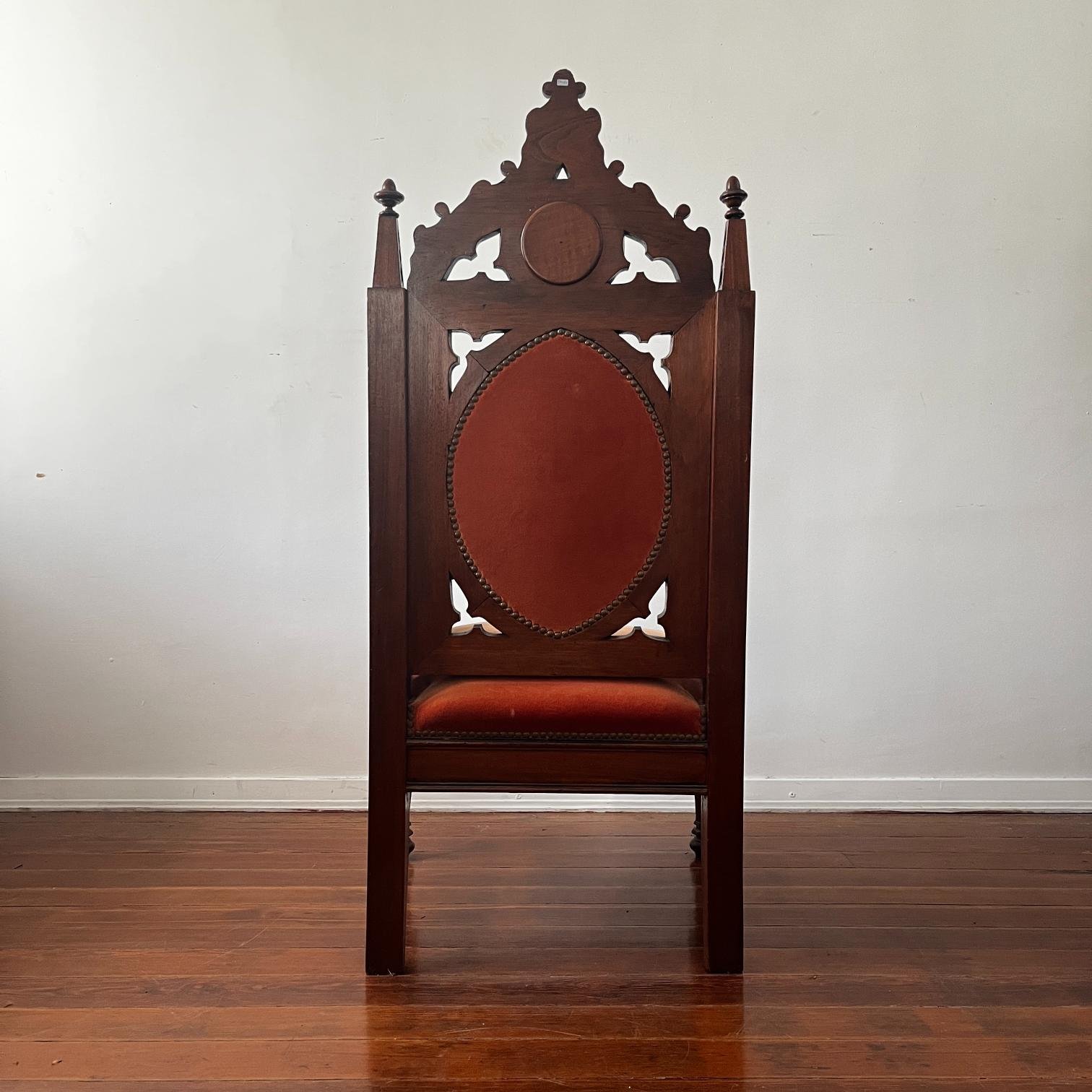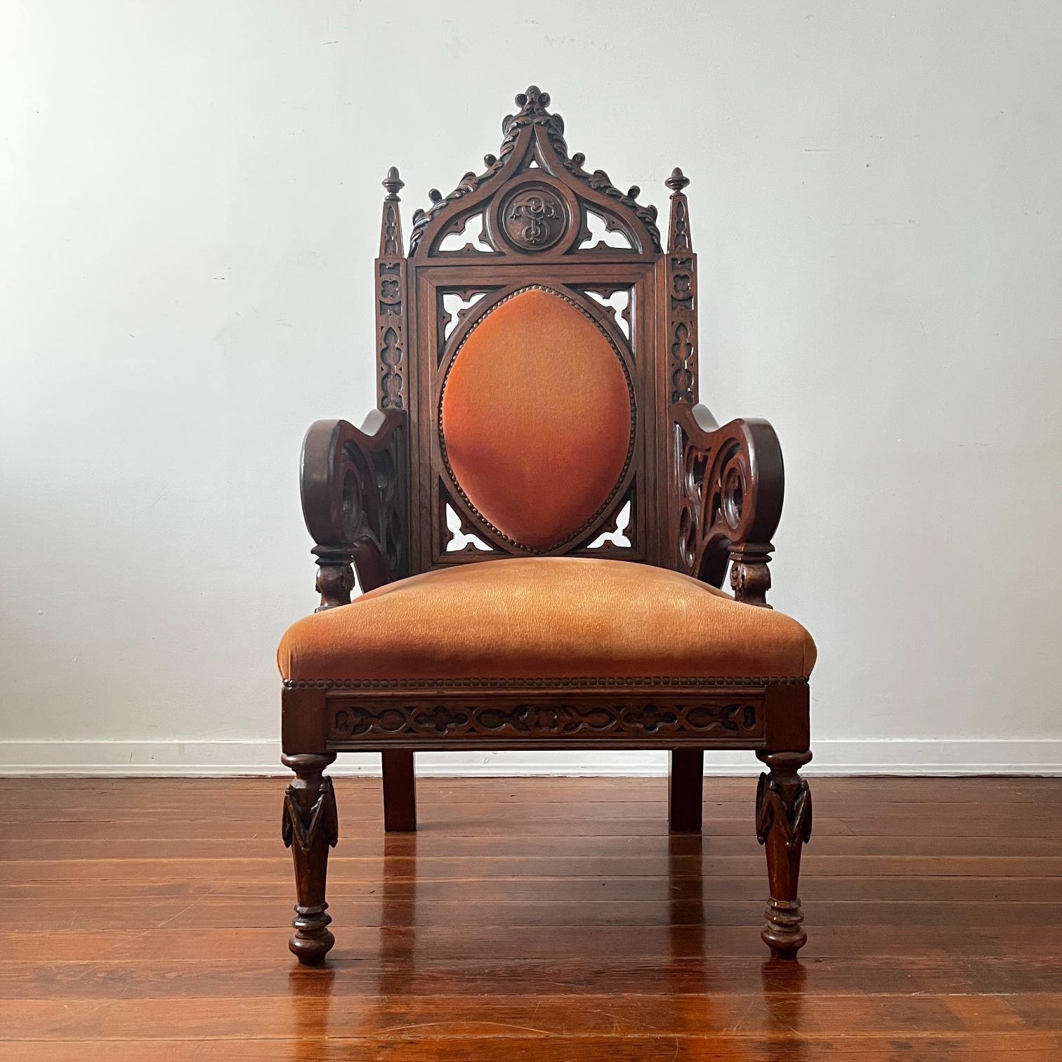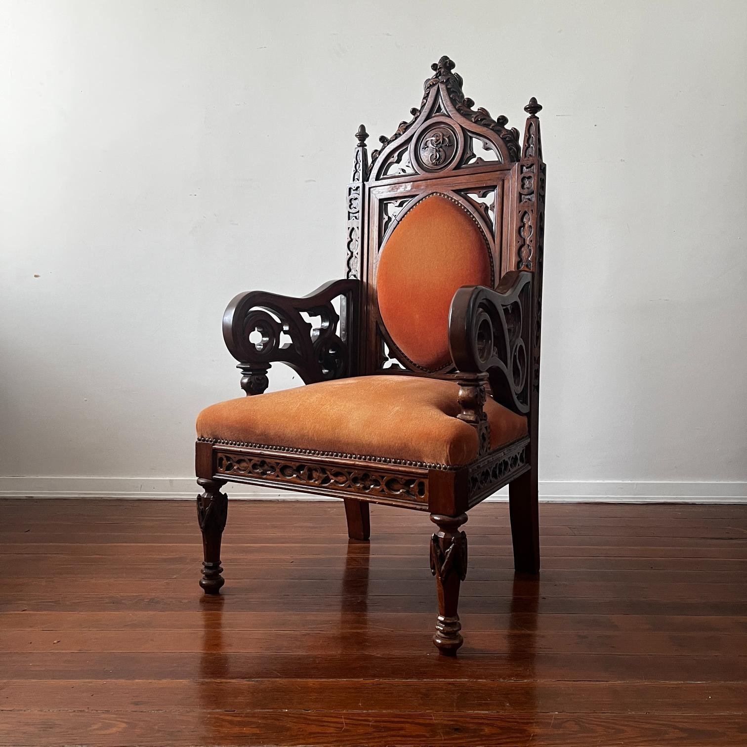Par de sitiales s. XIX estilo neogótico en madera de cedro calada y tallada «hojas y frutos», con iniciales «S.T.» en respaldo, pertenecientes a Salvador Tajes (1852-1912). Asientos y respaldos tapizados en pana.
