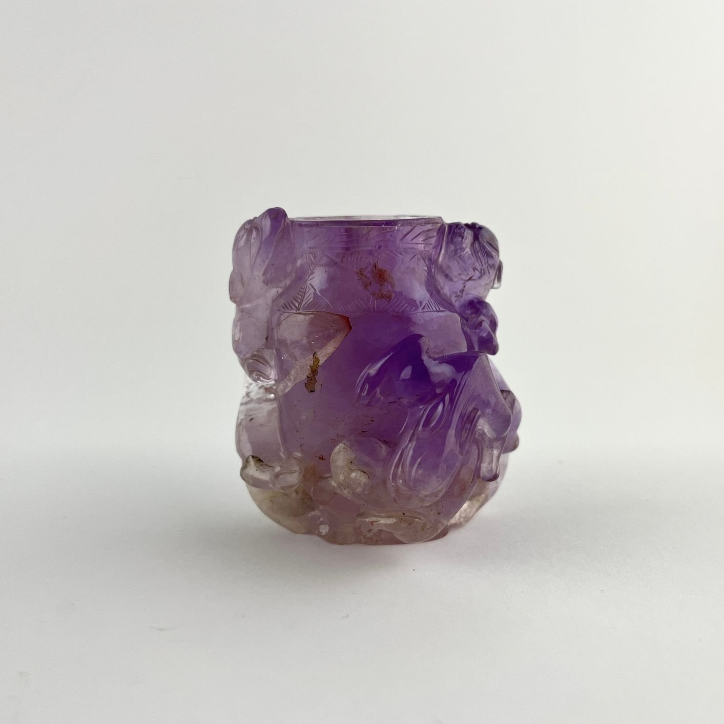 Snuff bottle china en amatista calada y tallada «tres qilong». Presenta pequeña avería. Falta tapa. Alto 6 cm.