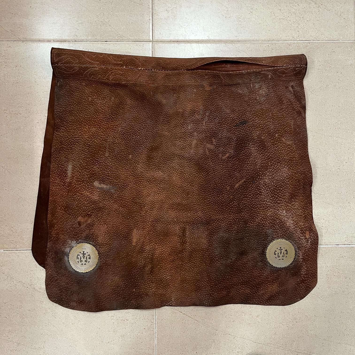 Sobrepuesto argentino en cuero de carpincho con cuatro medallones laterales en plata cincelada y calada con inicial “M”. Con punzón del platero J. Adriano. Pequeñas averías