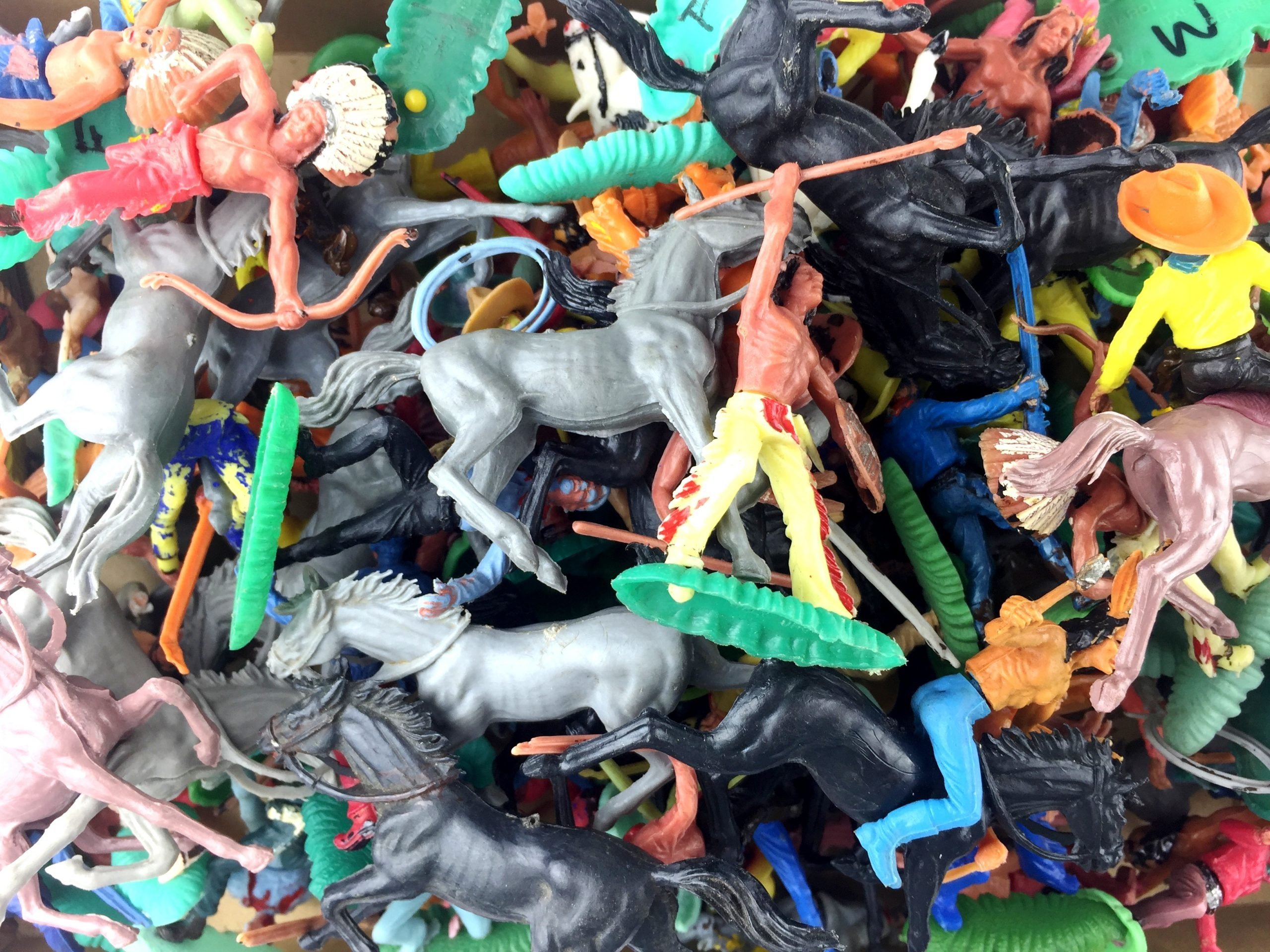 Lote de aprox. 110 soldaditos en plástico marca Nardi uruguayos. Indios y cowboys. Con fuerte en madera, de fabricación artesanal.