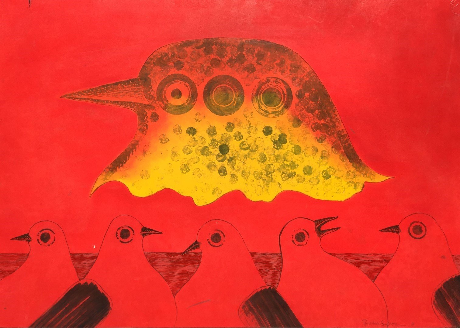 SUÁREZ, Ruisdael (escuela uruguaya, 1929-2004). Acrílico sobre cartulina pegada en fibra. «Palomas». Firmado y fechado «81» abajo a la derecha. 48 x 66 cm.