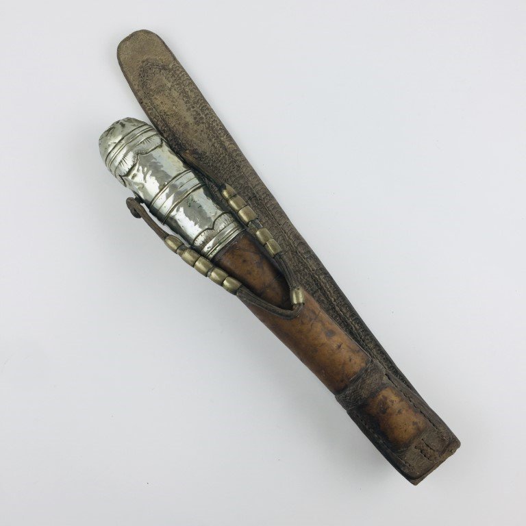 Talero argentino forrado en cuero. Cabo en alpaca cincelada «hojas». Manija en cuero crudo con diez pasadores. Con averías.