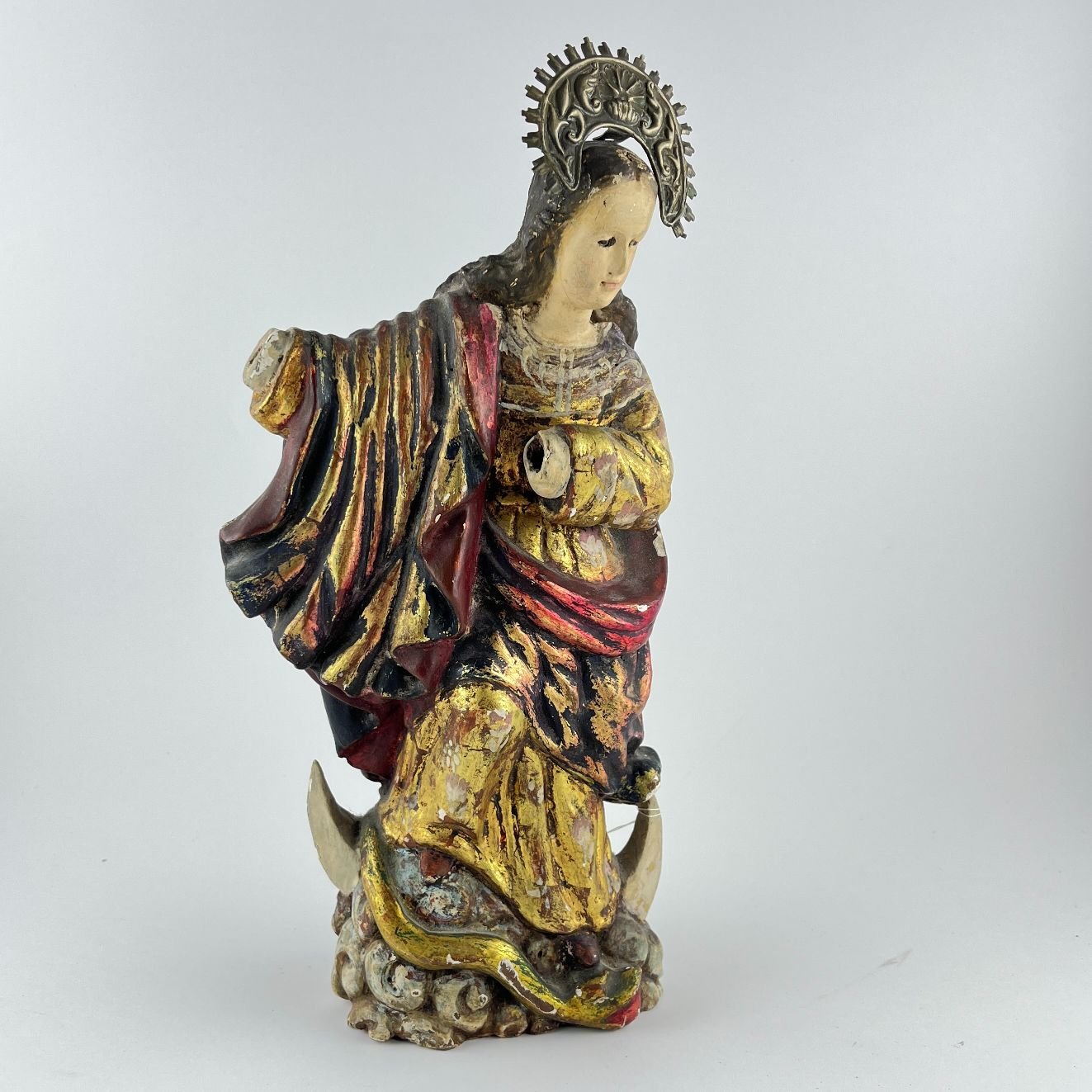 Talla brasileña en madera policromada y dorada sobre estuco. «Virgen María.» Con coronación en plata. Alto 29 cm. Faltan brazos.