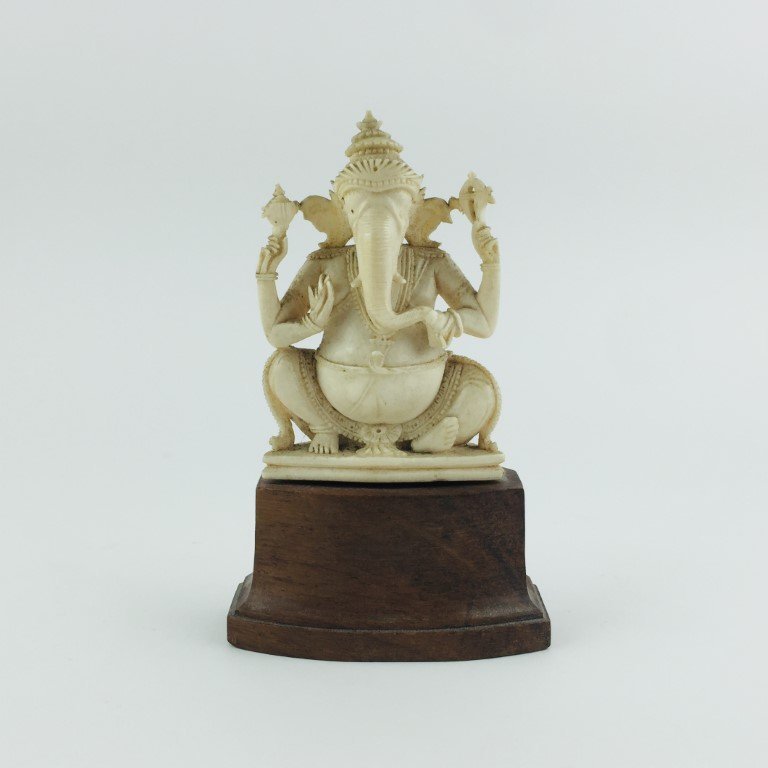 Talla china en colmillo de elefante. «Ganesh.» 8 x 5.5 x 2.5 cm. Presentado en base de madera.
