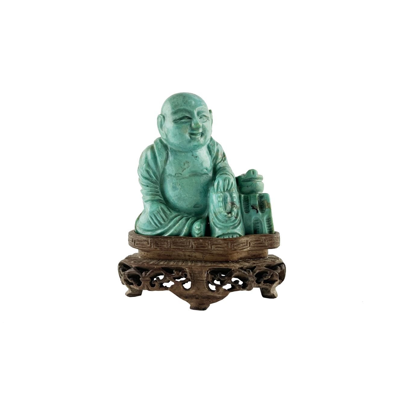 Talla china en turquesa. «Buda.» 5 x 4.5 x 2.5 cm. Presentada sobre peana en madera tallada y calada. Alto total 7 cm.