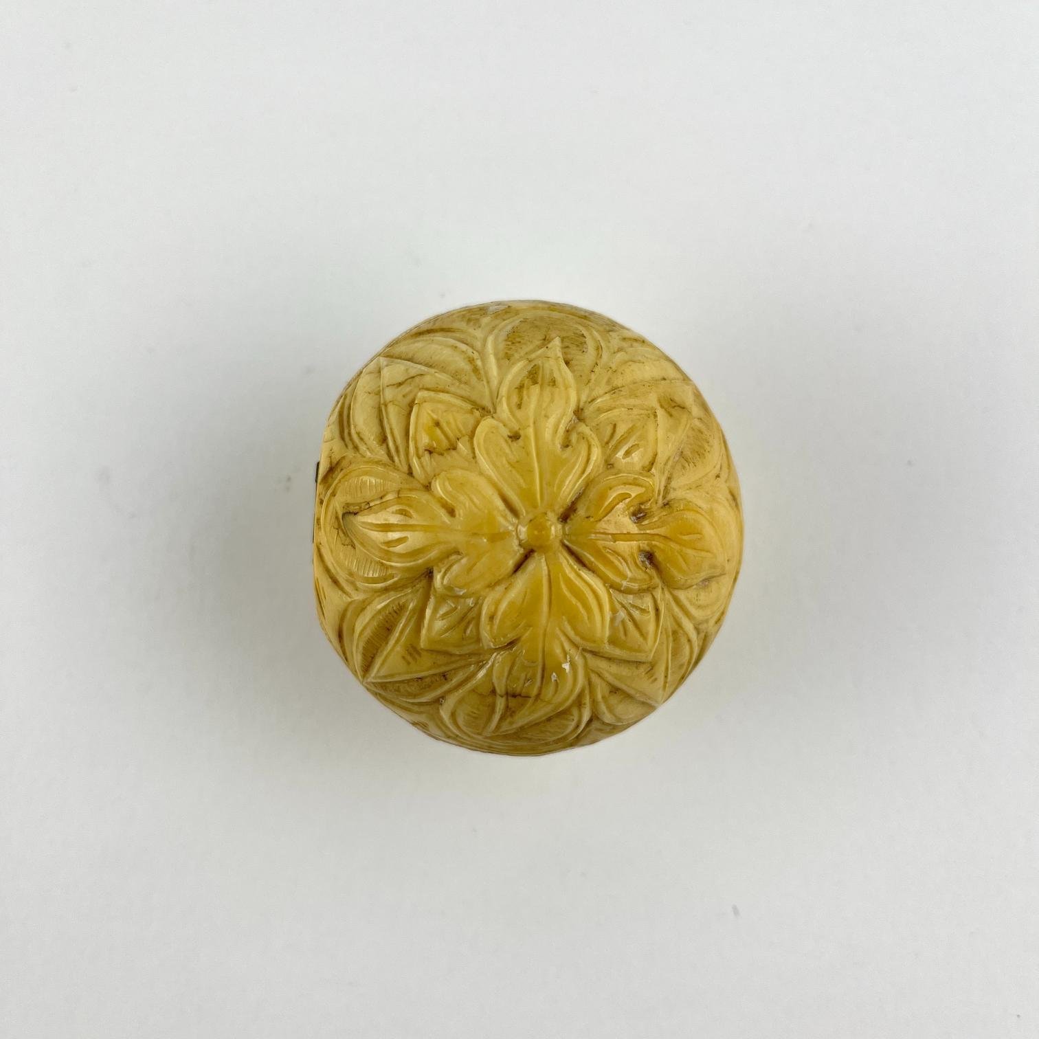 Talla francesa en marfil de Dieppe, s. XIX, en forma de nuez, con apertura en díptico e interior decorado «escena de coronación». Diámetro 5,5 cm.