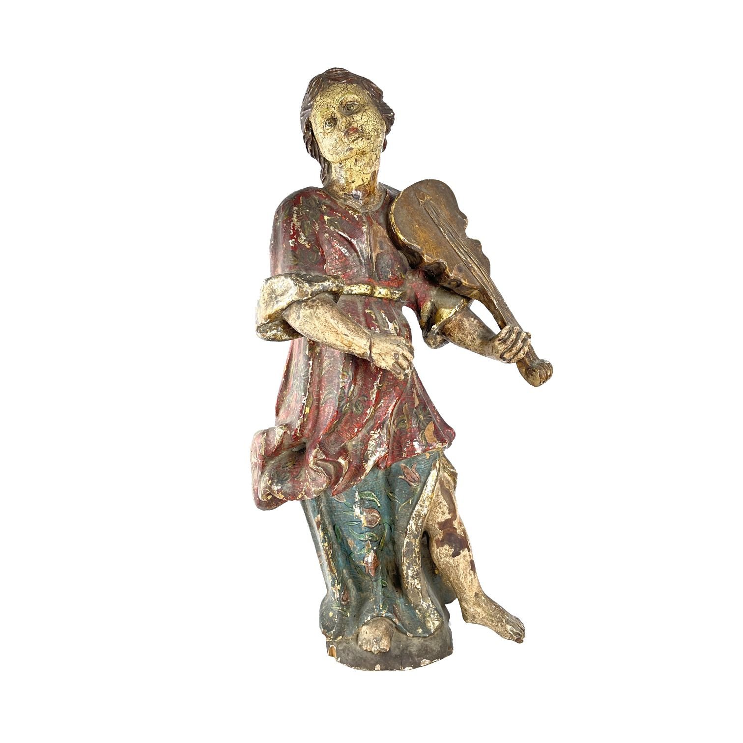 Talla jesuítica guaraní s. XVIII en madera tallada y policromada sobre estuco, con detallas en lámina de plata. «Santa Cecilia.» Alto 50 cm. Pequeñas averías y desgastes.