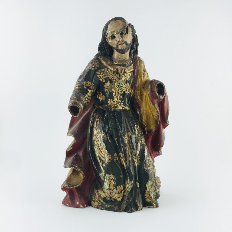 Talla quiteña s. XIX en madera y hojalata policromada y dorada. «Cristo.» 30 x 19 x 12 cm. Averías y faltantes.