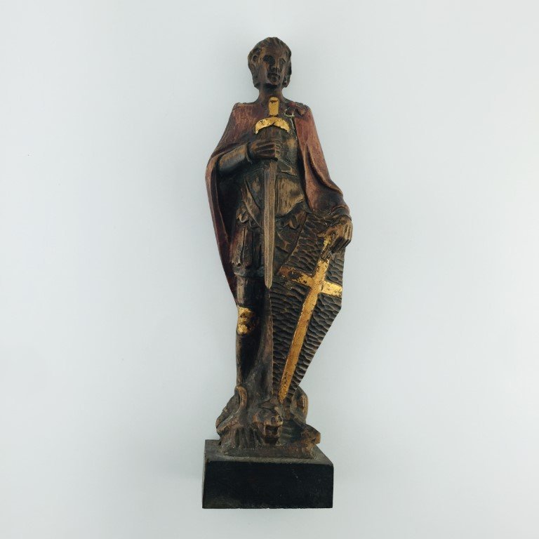 Talla quiteña s. XX en madera policromada y dorada. «San Jorge.» 38 x 10 x 7 cm. Firmado en la base.