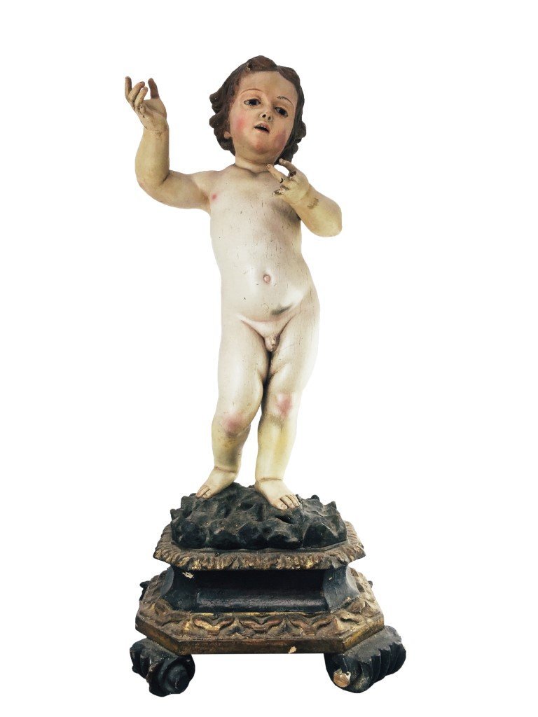 Talla europea s. XIX en madera policromada. «Angelote.» Ojos en vidrio. Presentado sobre peana de madera. 80 x 36 x 29 cm. Pequeñas averías y faltantes en dedos.
