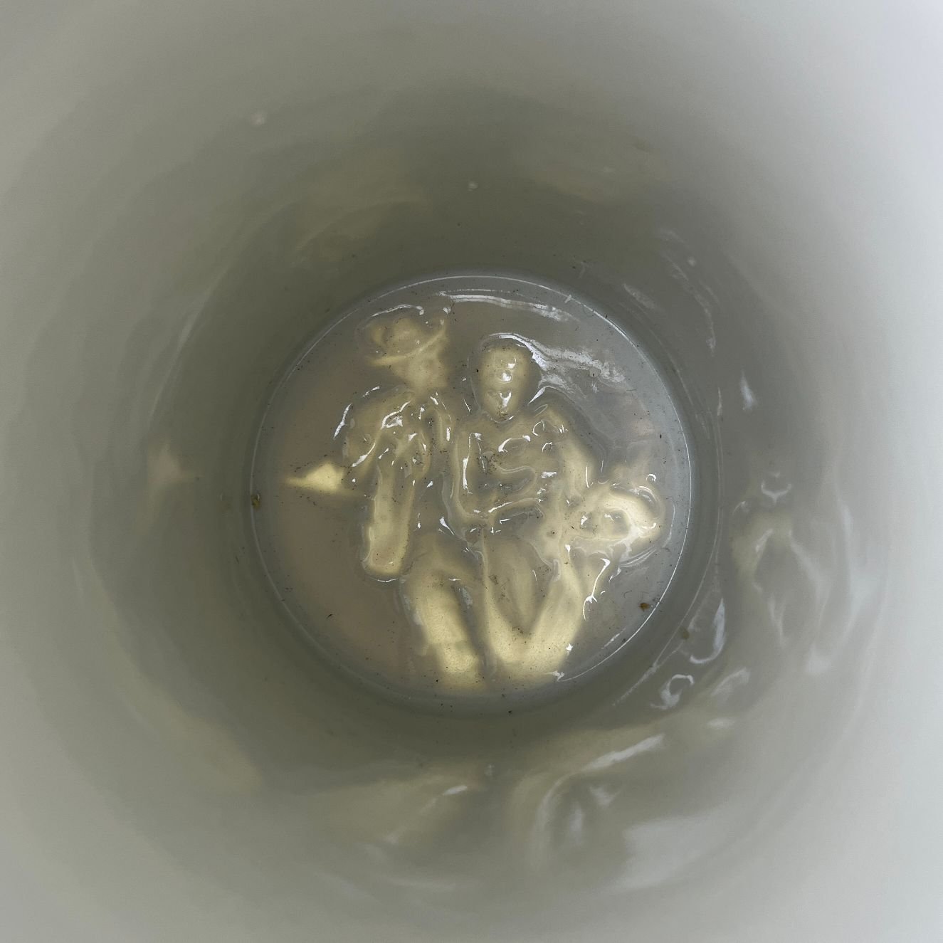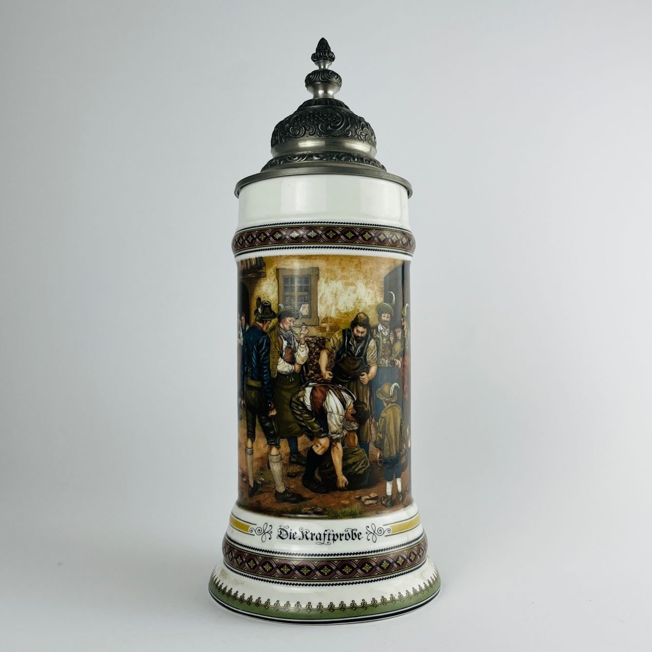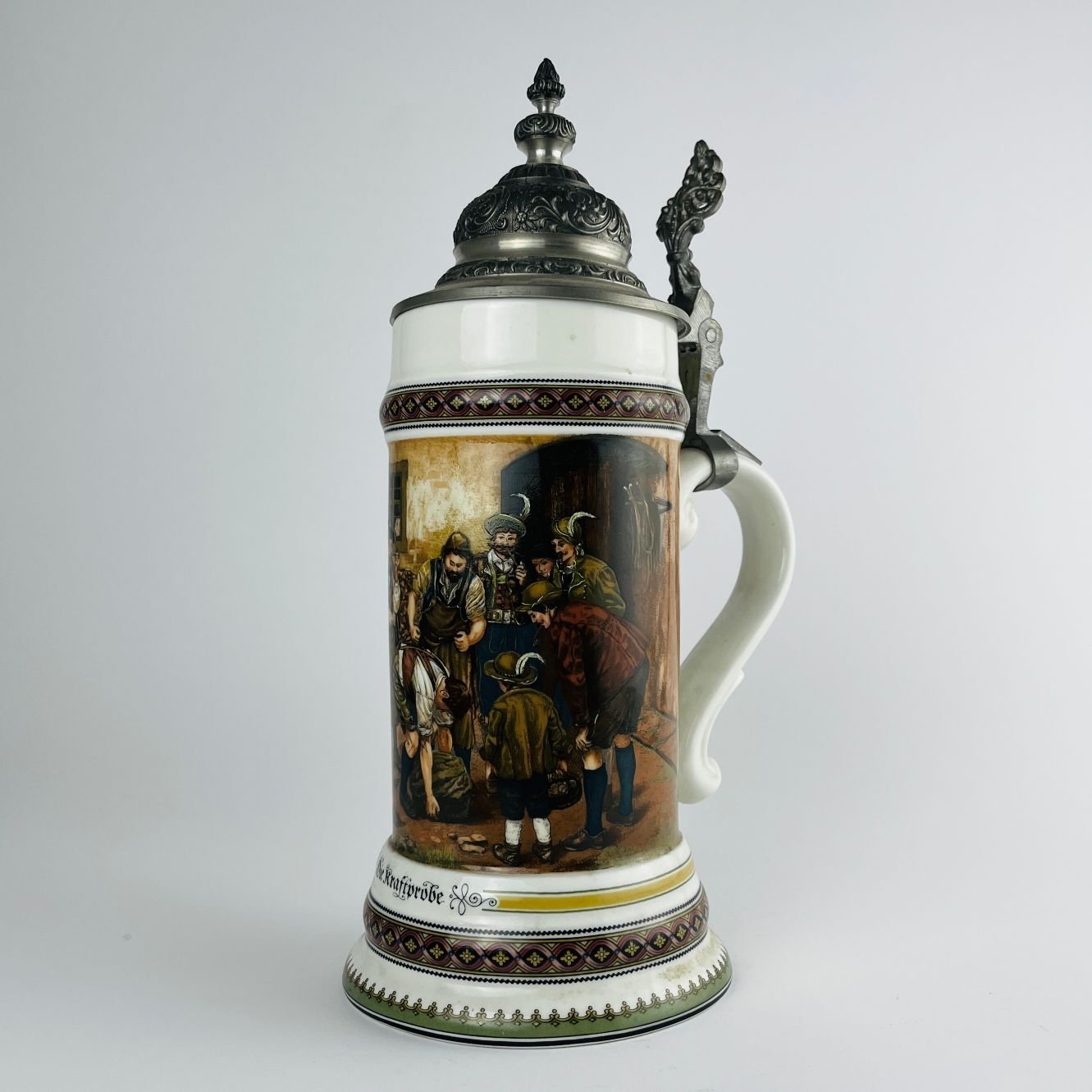 Tankard alemán en porcelana decorada «escena de pueblo». Tapa en peltre cincelada «hojas». Fondo traslúcido decorado «escena galante». Alto 26 cm.