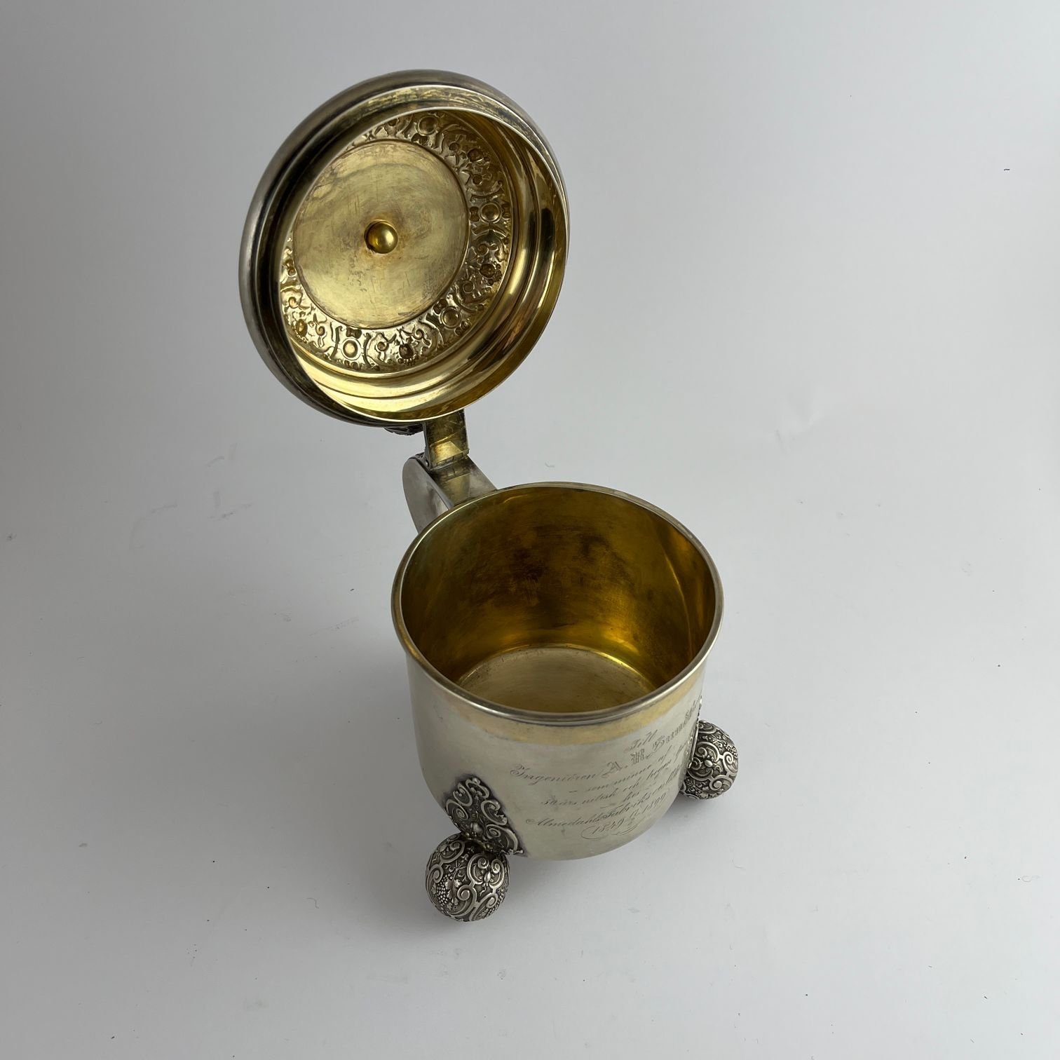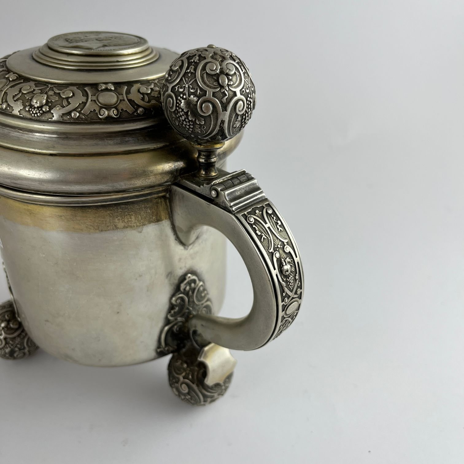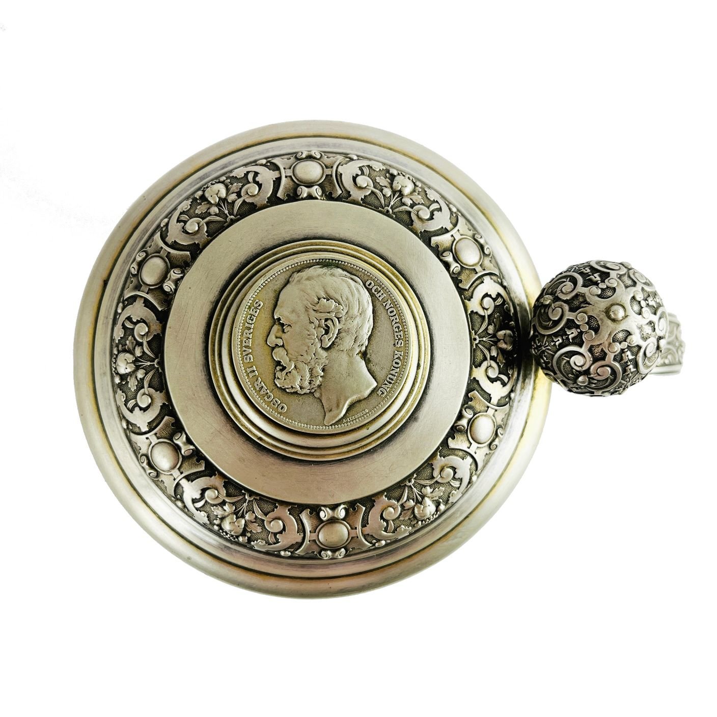 Tankard sueco en plata cincelada «vides, frutos y arabescos». Tres patas esféricas. Tapa decorada con moneda sueca con efigie de Oscar II de Suecia. Con dedicatoria grabada y fechada «1899». Interior vermeil. 18 x 14 cm. Peso 650 gr.