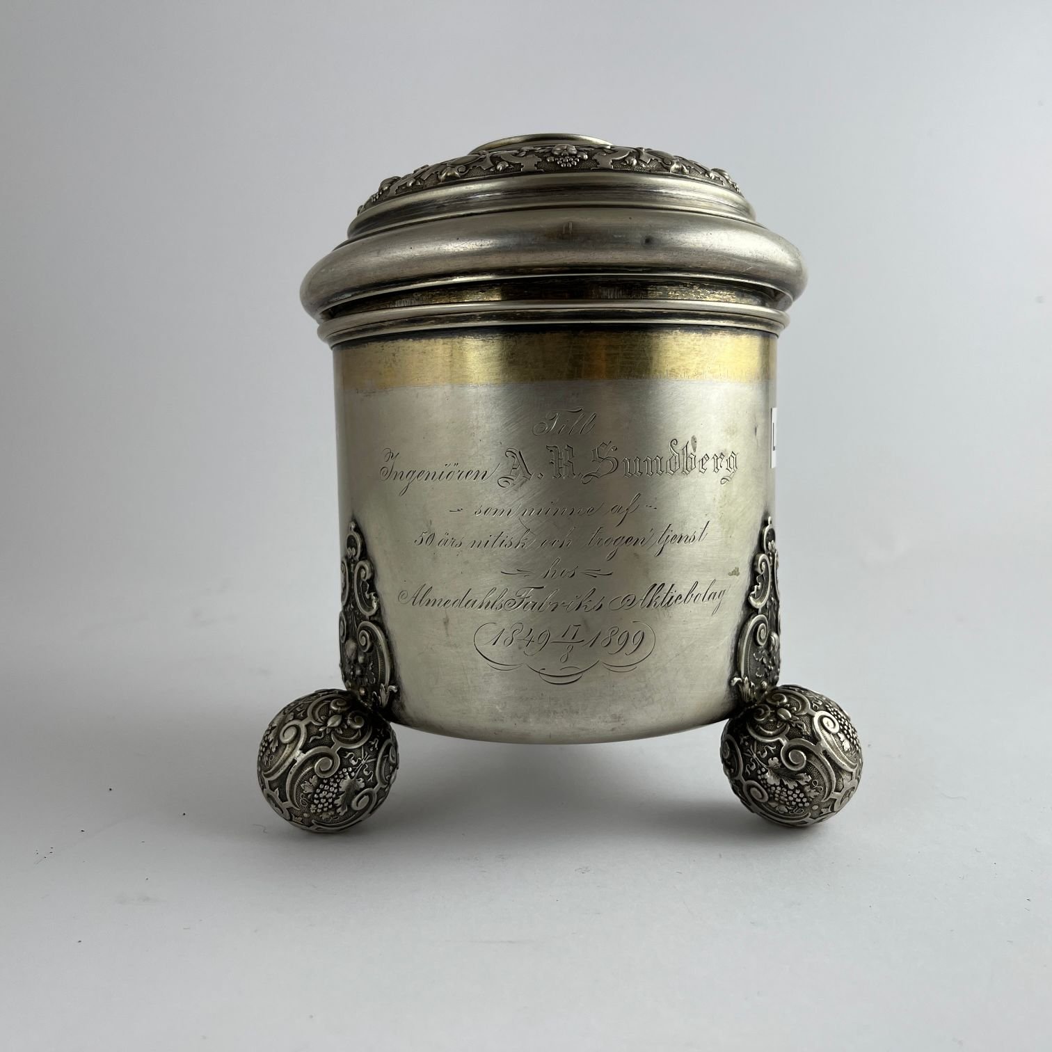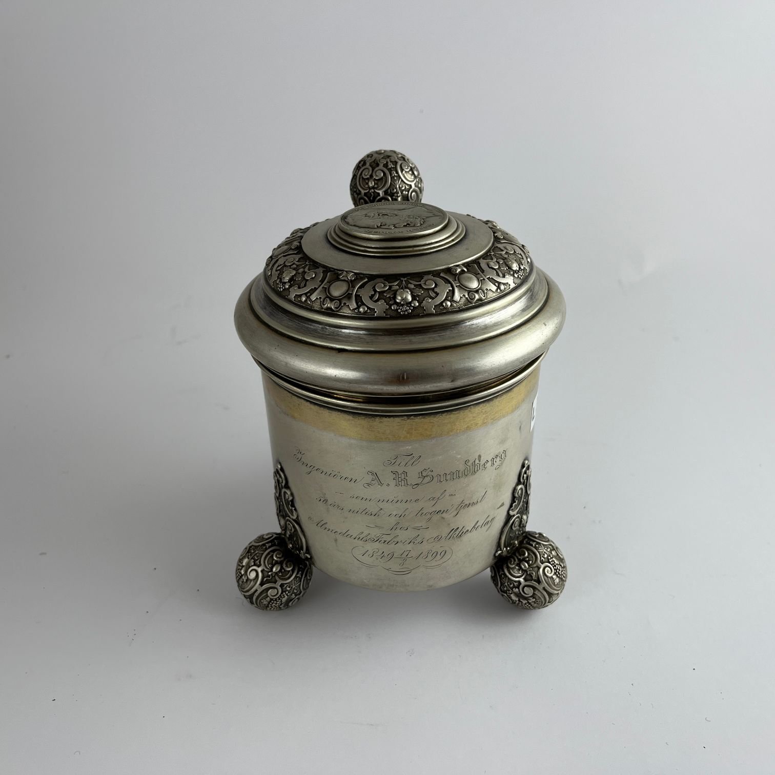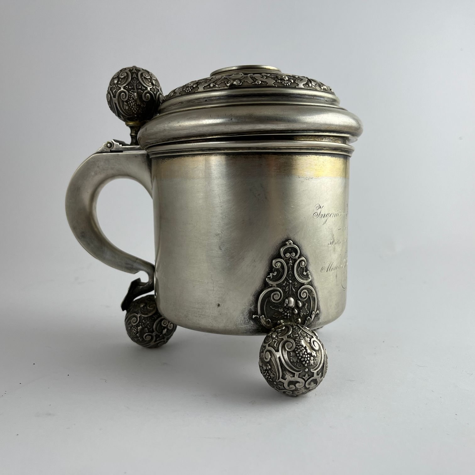Tankard sueco en plata cincelada «vides, frutos y arabescos». Tres patas esféricas. Tapa decorada con moneda sueca con efigie de Oscar II de Suecia. Con dedicatoria grabada y fechada «1899». Interior vermeil. 18 x 14 cm. Peso 650 gr.