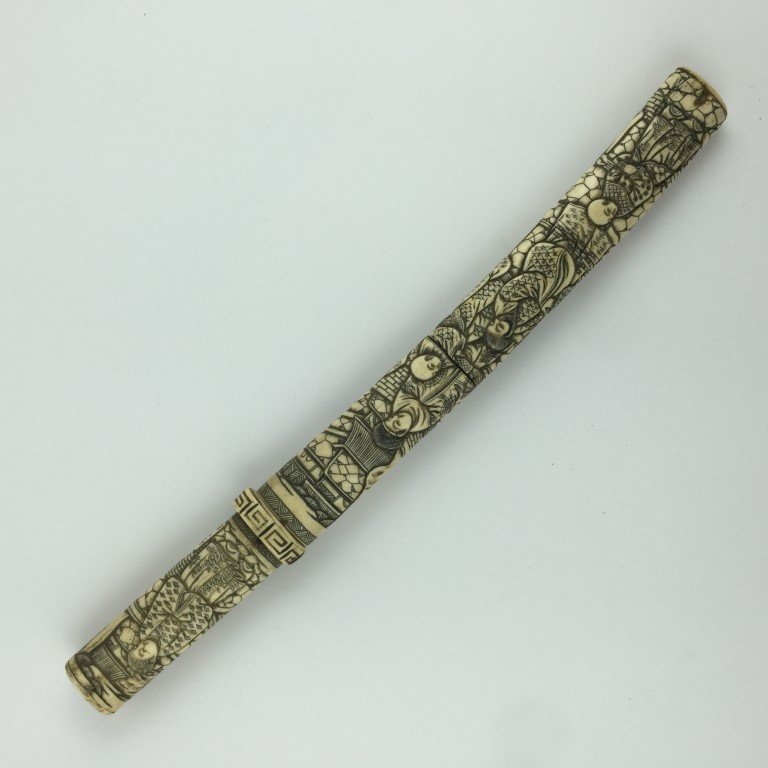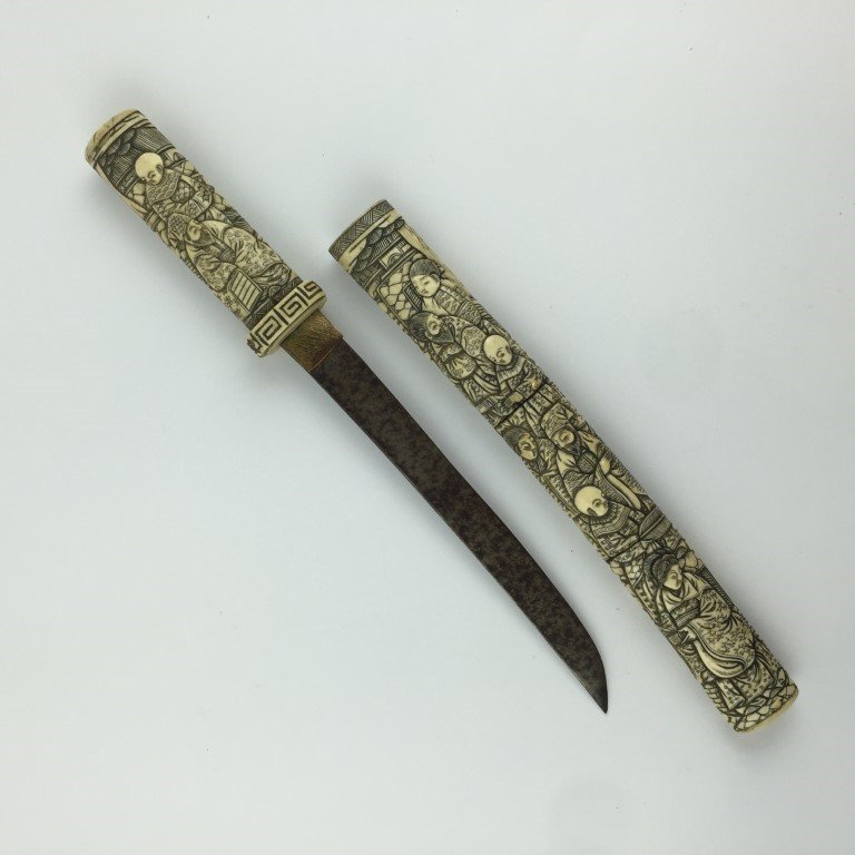 Tanto japonés con cabo y vaina en hueso totalmente tallado «escenas típicas». Largo 40.5 cm.