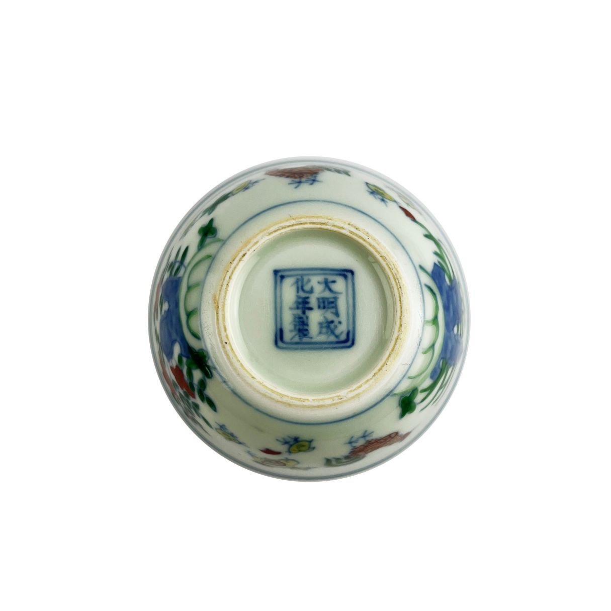 Taza de vino china Chenghua, chicken cup, en porcelana decorada con paleta doucai. Base con sello del emperador Chenghua.
