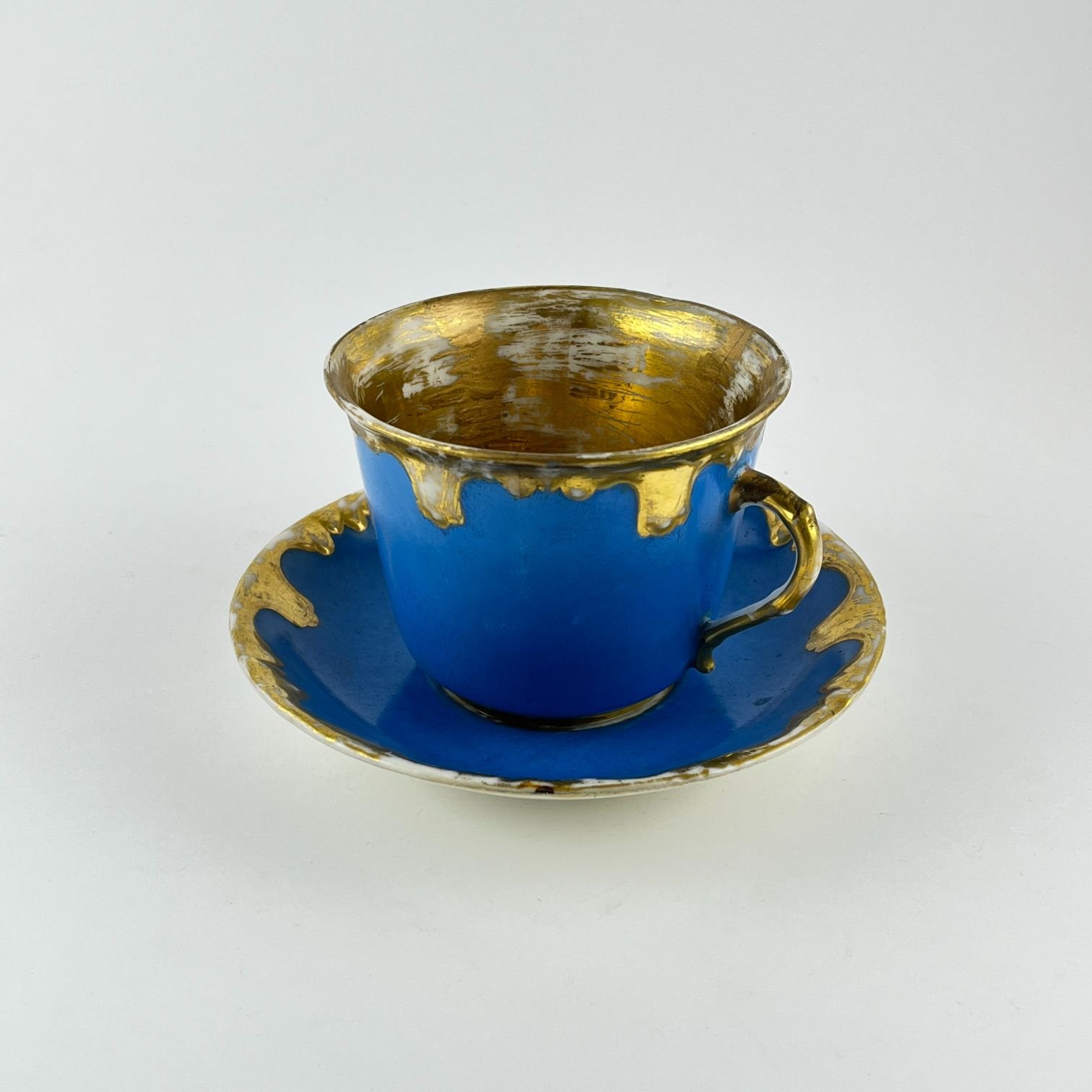 Taza y platillo en porcelana policromada «escudo de armas uruguayo» con detalles en dorado. 9.5 x 16.5 cm. Base de taza restaurada.