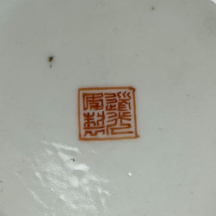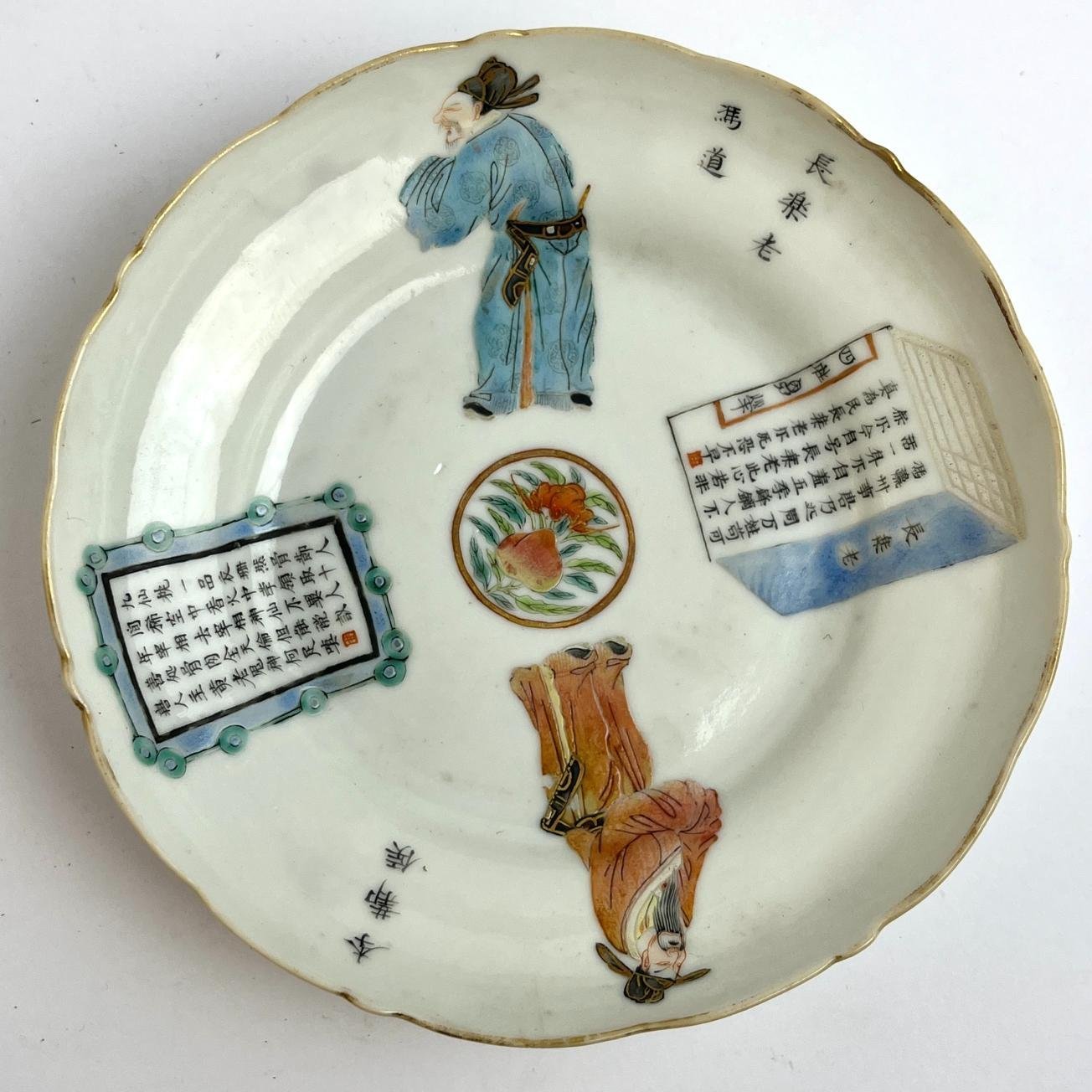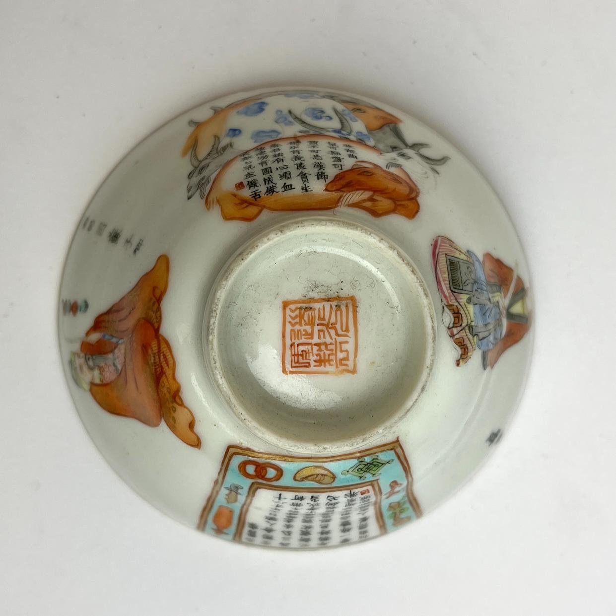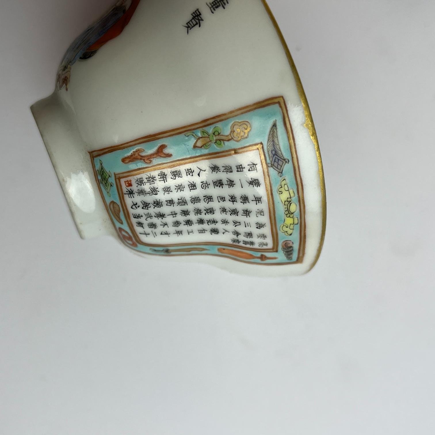 Taza de té china, con platillo y tapa, s. XIX, en porcelana familia rosa decorada «personajes» y textos. Marcas del período en cada pieza. 12,5 x 7,5 cm.