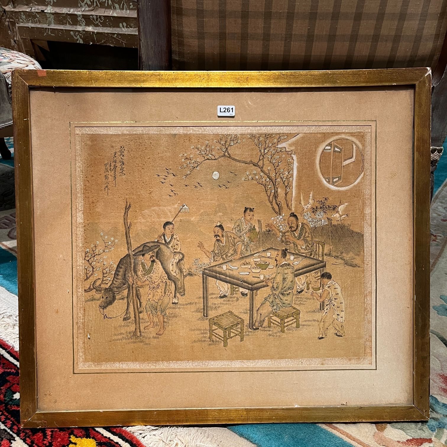 Técnica mixta sobre seda, s. XIX. «Escena típica china.» Inscripción arriba a la izquierda. 35 x 43 cm.