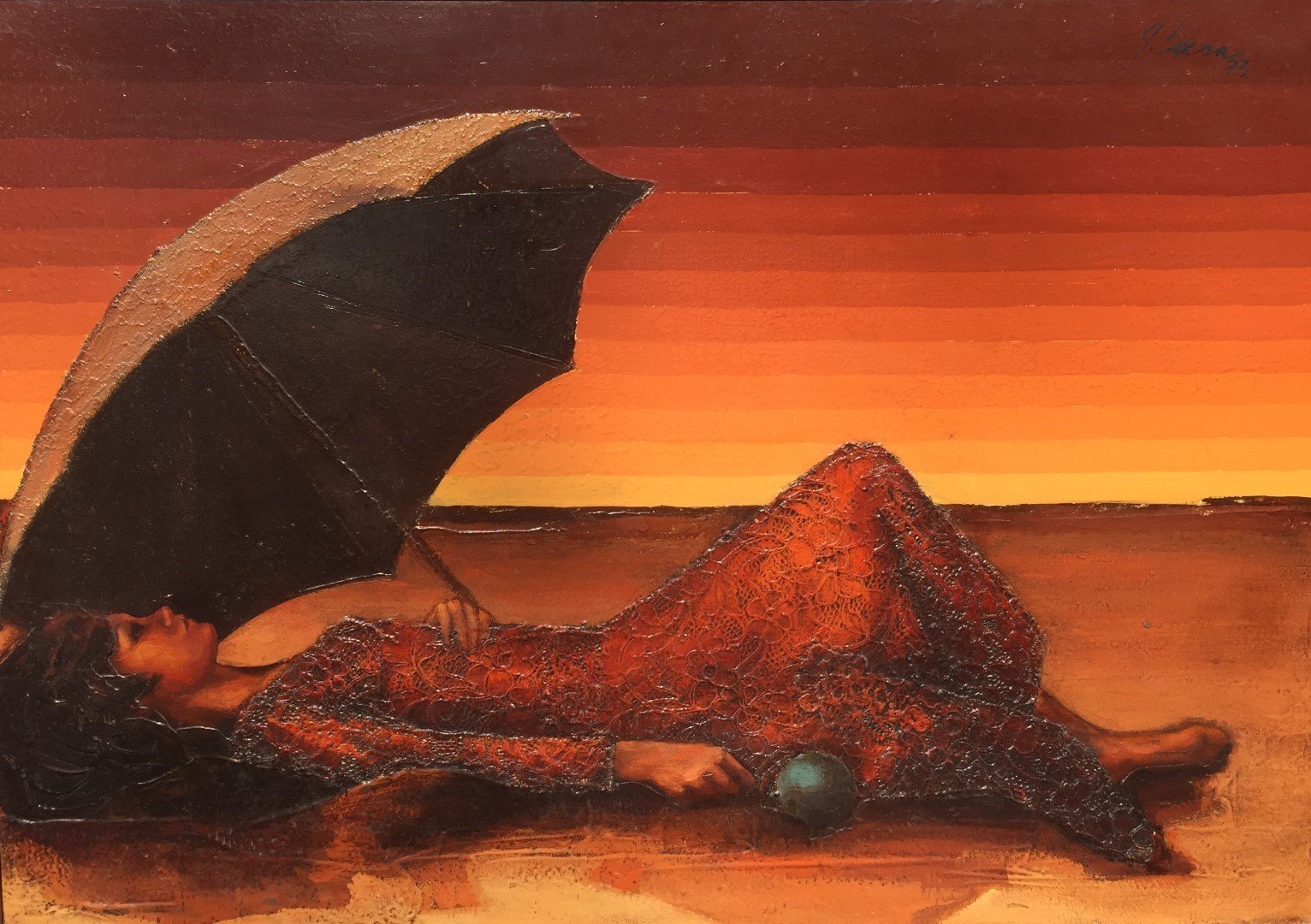 TEJERA, Miguel Ángel (escuela uruguaya, 1938-2008). Acrílico sobre tela. «Bajo el sol.» Firmado y fechado «73» arriba a la derecha. 70 x 100 cm.